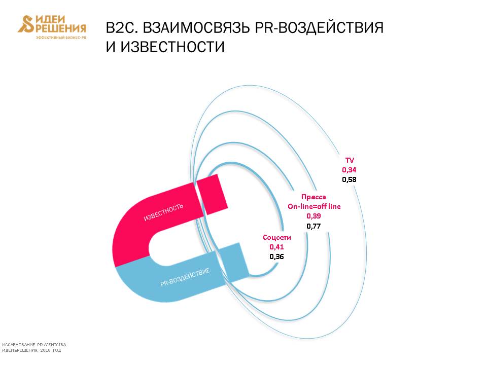 По итогам исследования рассчитана корреляция активности более чем 80 брендов в социальных сетях и их известности. Степень влияния SMM на brand awareness оказалась максимальной, опережая прессу (как онлайн, так и офлайн), а также телевидение.