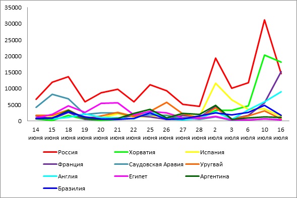 По данным статистики, самой упоминаемой футбольной командой в СМИ стала сборная России. Так, минимальное количество новостей о ней было опубликовано 28 июня, что составило 4600 публикаций, а максимальное – 10 июля (более 30 000 сообщений). С первого дня чемпионата Россия прочно закрепилась на первой позиции рейтинга популярности и только в последний день турнира опустилась на третье место, уступив Хорватии и Франции.
