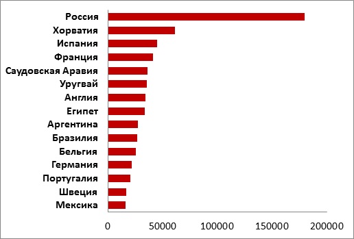 Следующие три команды ненамного отстали от первой пятерки. Уругвай упоминали в 35 405 публикациях, Англию – в 34 403, а Египет – в 33 931. Национальным сборным остальных стран – участниц чемпионата мира было посвящено менее 30 000 новостей в СМИ за весь период турнира.