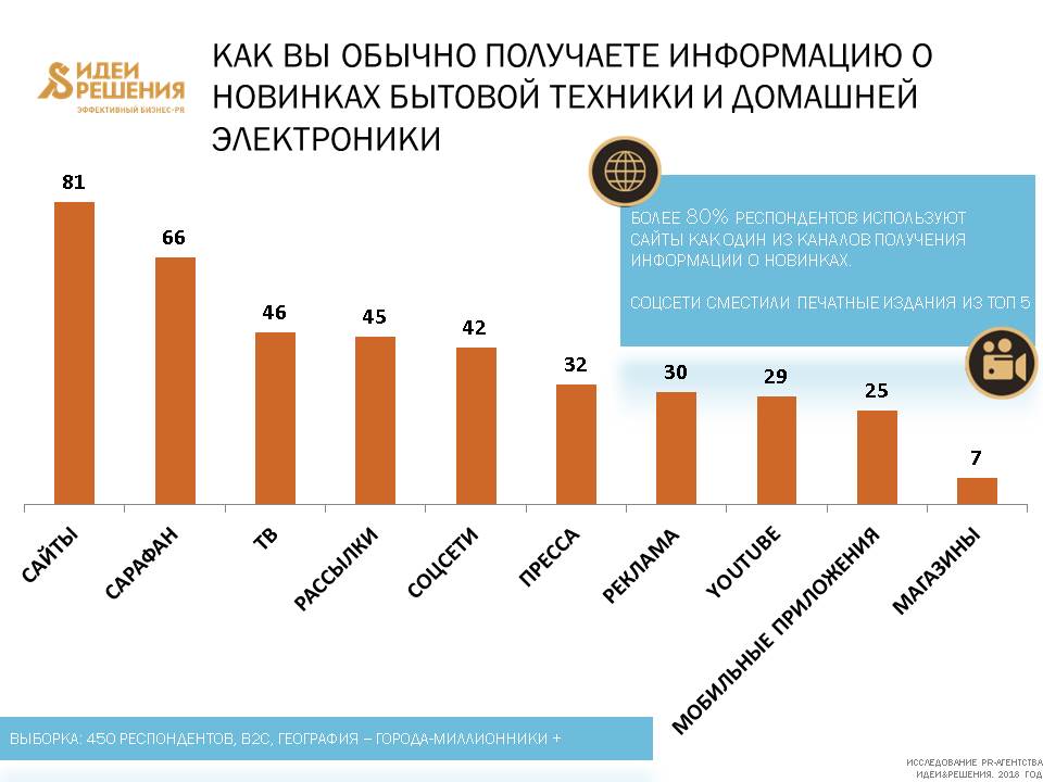 «Под прессой мы понимаем классические журналы и газеты на бумаге. 32 % потребителей узнают о новинках бытовой техники и электроники из печатных изданий, тогда как 42 % респондентов чаще ориентируются на отзывы и рекомендации, размещённые в социальных сетях. В других отраслях, по данным наших опросов, печатные СМИ вернулись в топ-5 источников информации к началу 2018 года, произошел некий ренессанс печати. Но не для бытовой техники…», – отметила Анастасия Иванова, руководитель направления бытовой техники и электроники PR-агентства Идеи&Решения.