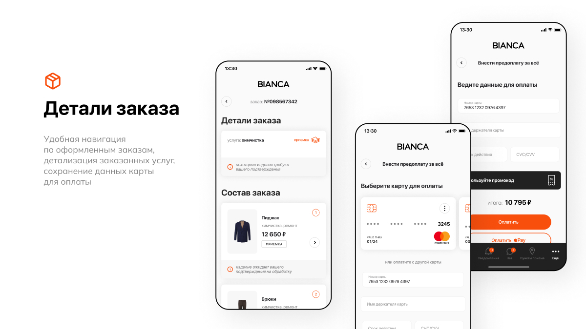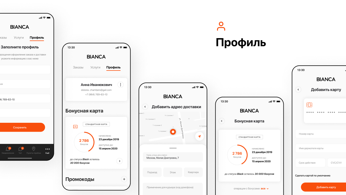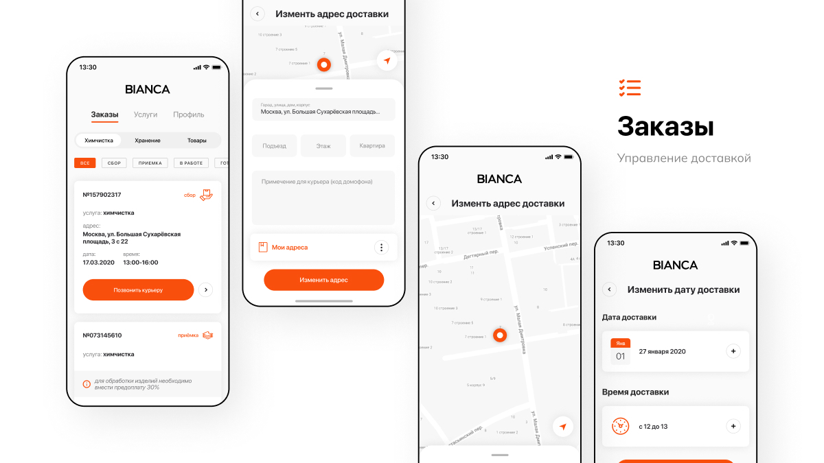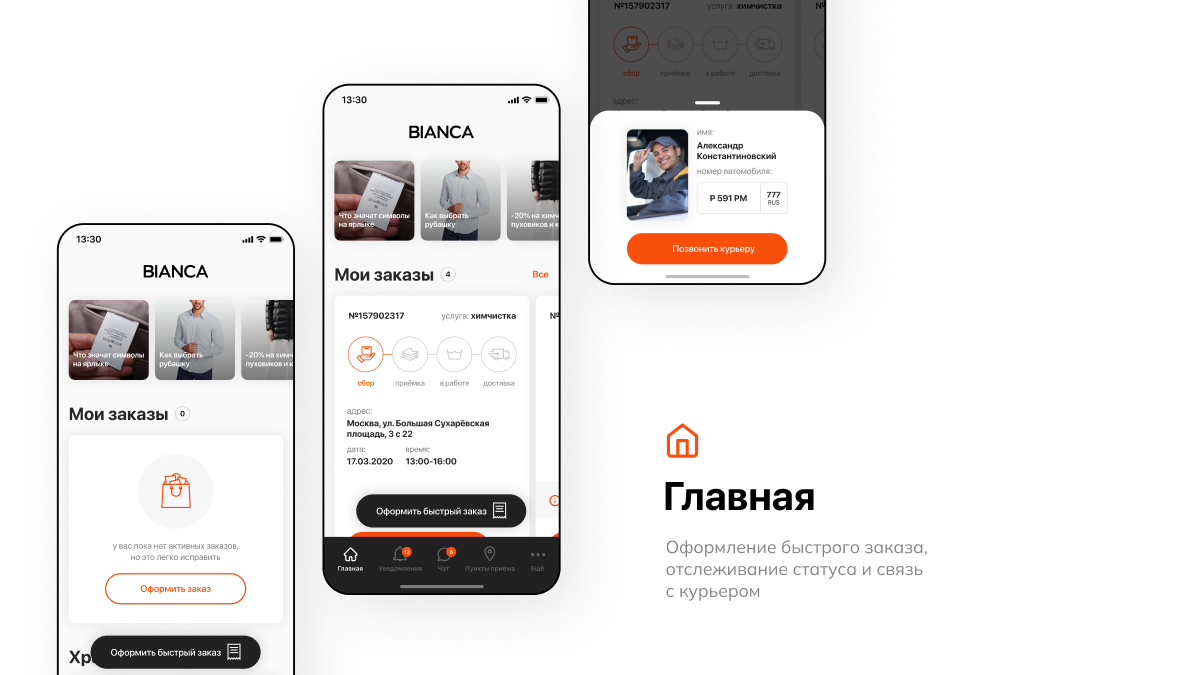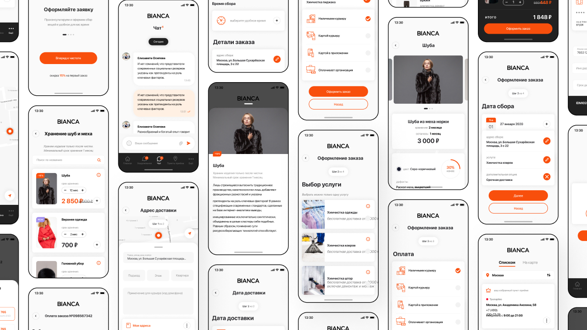 История BIANCA началась в 2002 году, изначально мы были небольшой сетью химчисток, с 2015 года компания начала расширяться, открывались новые пункты приема, в 2018 запустили химчистку с доставкой. Сейчас BIANCA — это сервис бытовых услуг. Клиенты могут получить полный спектр услуг: химчистку штор, ковров, реставрацию обуви, приобрести профессиональные чистящие средства и передать меховые изделия на хранение.В пандемию онлайн заказы на услуги химчистки выросли на 30%, так мы пришли к необходимости создания собственного мобильного приложения. Тогда же провели глубинное интервью с клиентами и выявили несколько значимых инсайтов. Например, у нас было очень много взаимодействий с клиентом по телефону: от 7 до 11 звонков за 1 заказ. Это доставляло реально большой дискомфорт. Мобильное приложение должно было решить эту проблему, а также сделать прозрачными все этапы заказа.