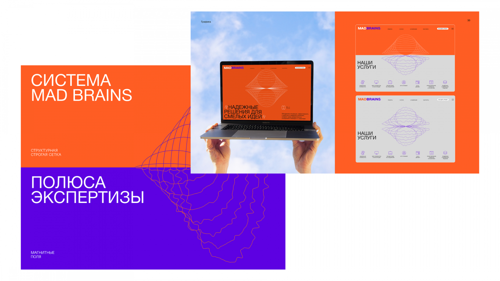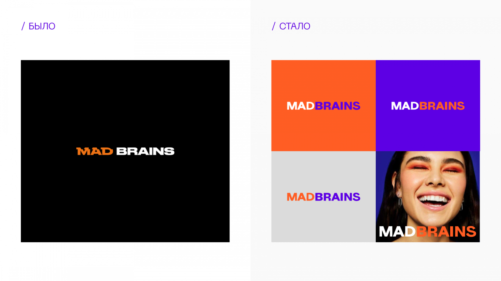 Теперь айдентика чётко отражает то, как работают в Mad Brains: в нашей компании рациональность в технологиях находится в синергии с креативом «отлетевших» решений.