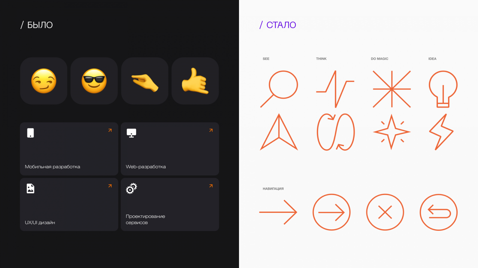 Стиль предполагал активную работу с типографикой вместо иконок. Нас это ограничивало, поэтому, по необходимости, мы подбирали их вручную, иногда использовали эмодзи. На первых порах всё устраивало, но со временем стало очевидно: это идет вразрез со статусом и масштабом бизнеса наших клиентов.