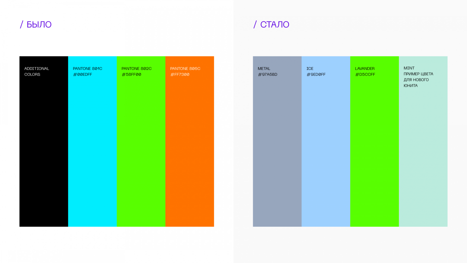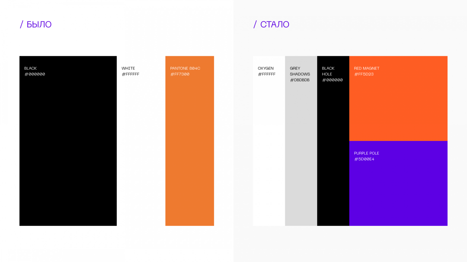 Дополнительные цвета теперь: фиолетовый, белый, серый, черный. Яркие цвета олицетворяют творческий подход. Монохромные — системность и интеллект.