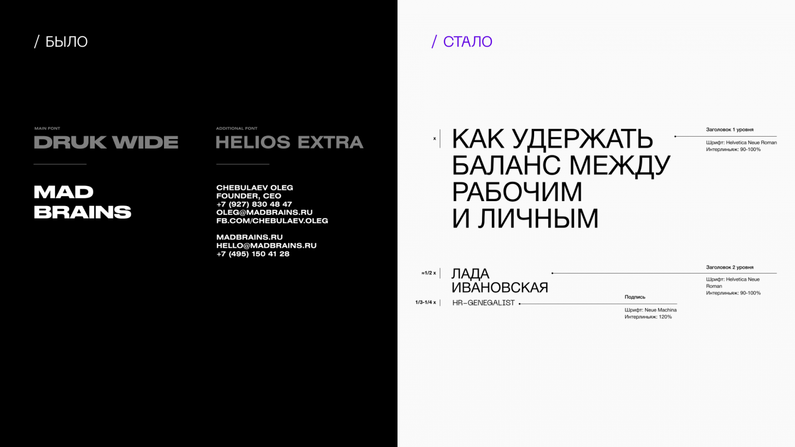 Соединяя яркие и монохромные цвета, мы акцентировали смыслы. Оранжевый «Mad» — наша креативность, строгий «Brains» — экспертность в технологиях. В работе мы всегда объединяли первое со вторым, а цветовой симбиоз хорошо закреплял этот подход.
