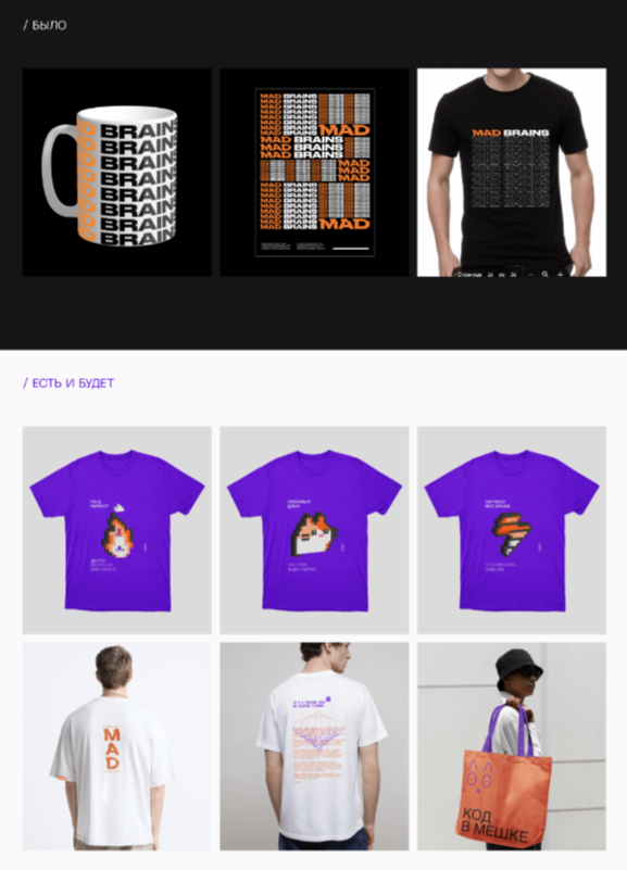Нам было необходимо, чтобы юниты, существуя внутри единой экосистемы Mad Brains, все же выделялись. Для этого мы присвоили им определенные цвета. Используем их теперь при оформлении постов, лендингов, сувенирной продукции.