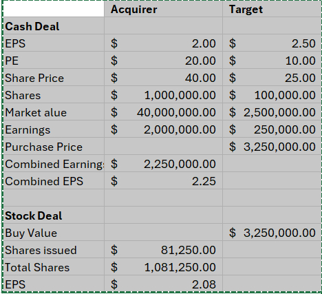 Вы должны заметить, что в ходе операции с наличными деньгами не было выпущено новых акций, поэтому прирост прибыли на акцию (EPS, earnings per share, прим. пер.) выше. Компания с высоким показателем P/E (20), приобретающая компанию с более низким P/E (10), таким образом, получает увеличение прибыли на акцию, даже если цена покупки превышает рыночную стоимость. Однако, если только в сделке нет синергии или усиливающих преимуществ, комбинация не выгодна, если он переплатит больше, чем 250 000 долларов за целевую компанию. А в этом случае он заплатил 30-процентную премию ($3 250 000/$2 500 000 = 130%, прим. пер.).