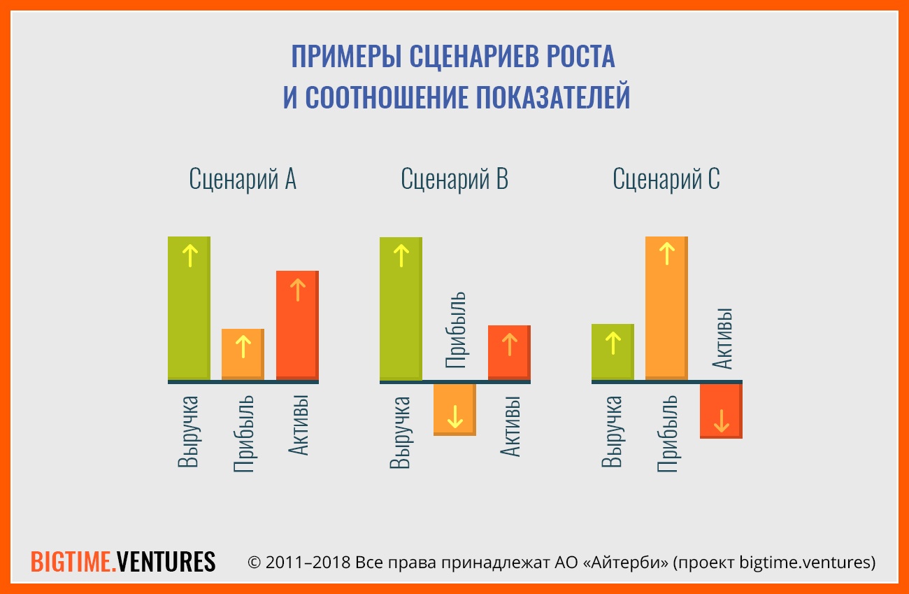Изначально определив правильное соотношение выручки, прибыли и активов для своего бизнеса, можно изменить отношение к тому или иному сценарию роста, который рассматривается в качестве инструмента достижения желаемого сценария будущего. Необходимо решить, что для вас важнее – выручка, прибыль, активы или еще что-то? И только после этого разрабатывать план действий и сквозную систему целей.