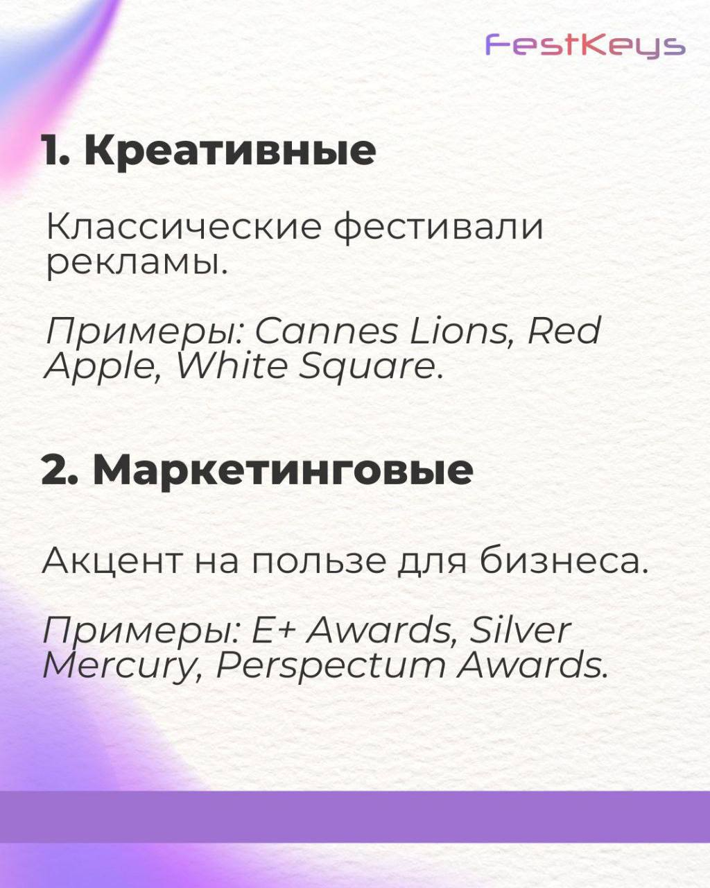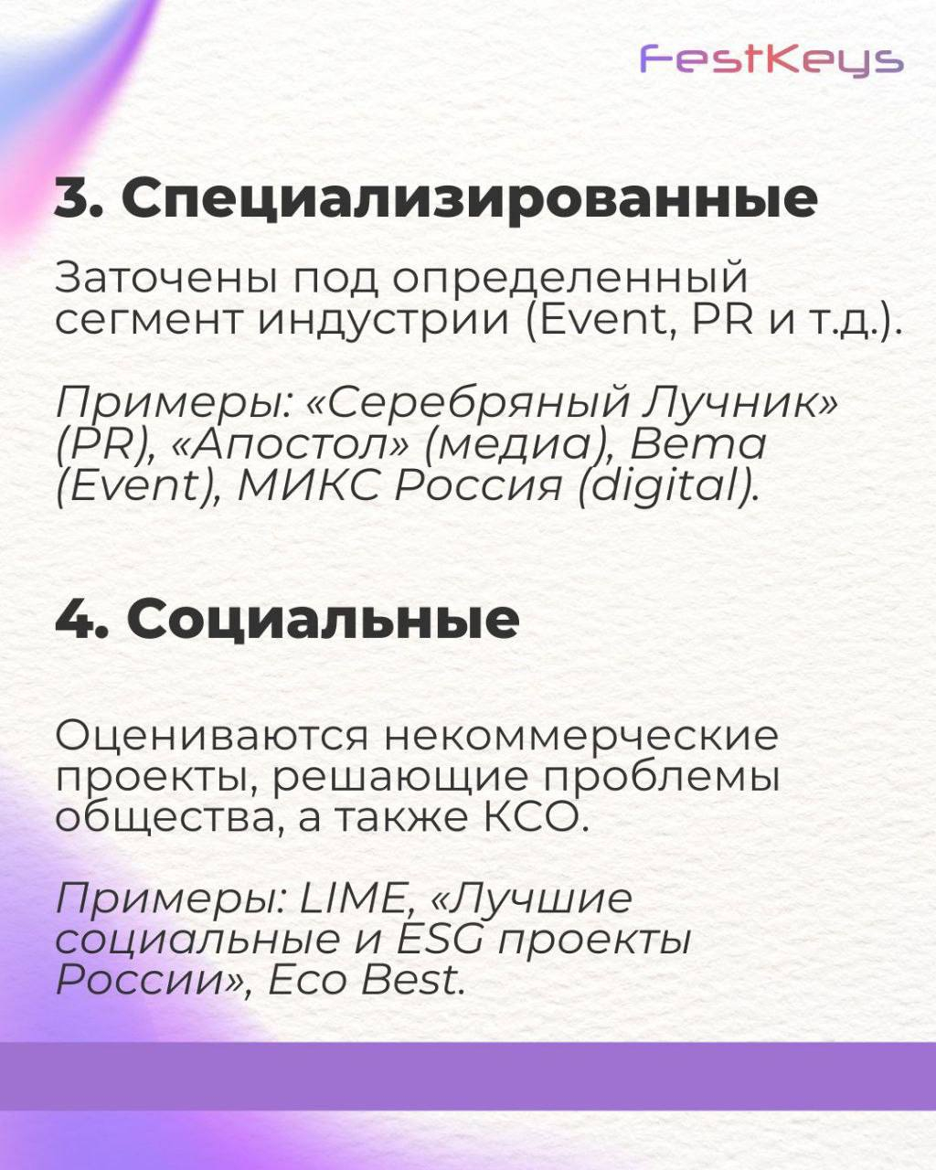 1️⃣ Определите, какие награды вам нужны для развития бизнеса. Например, вы специализируетесь на Event-маркетинге и планируете укреплять свои позиции в этой же сфере. Тогда вам нужны в первую очередь специализированные конкурсы (например, Bema) или Event-номинации фестивалей широкого профиля. Или вы, например, проводите мероприятия, но хотите добавить направление PR. Тогда вам будет интересен «Серебряный Лучник» или PR-номинации. Бывает, что какие-то премии пользуются особенным авторитетом у ваших клиентов и партнеров – тогда вам стоит сфокусироваться на них. И наконец, есть конкурсы, относящиеся к конкретным отраслям – например, «Большой оборот» (E-Com), MedMen Awards (фарма).