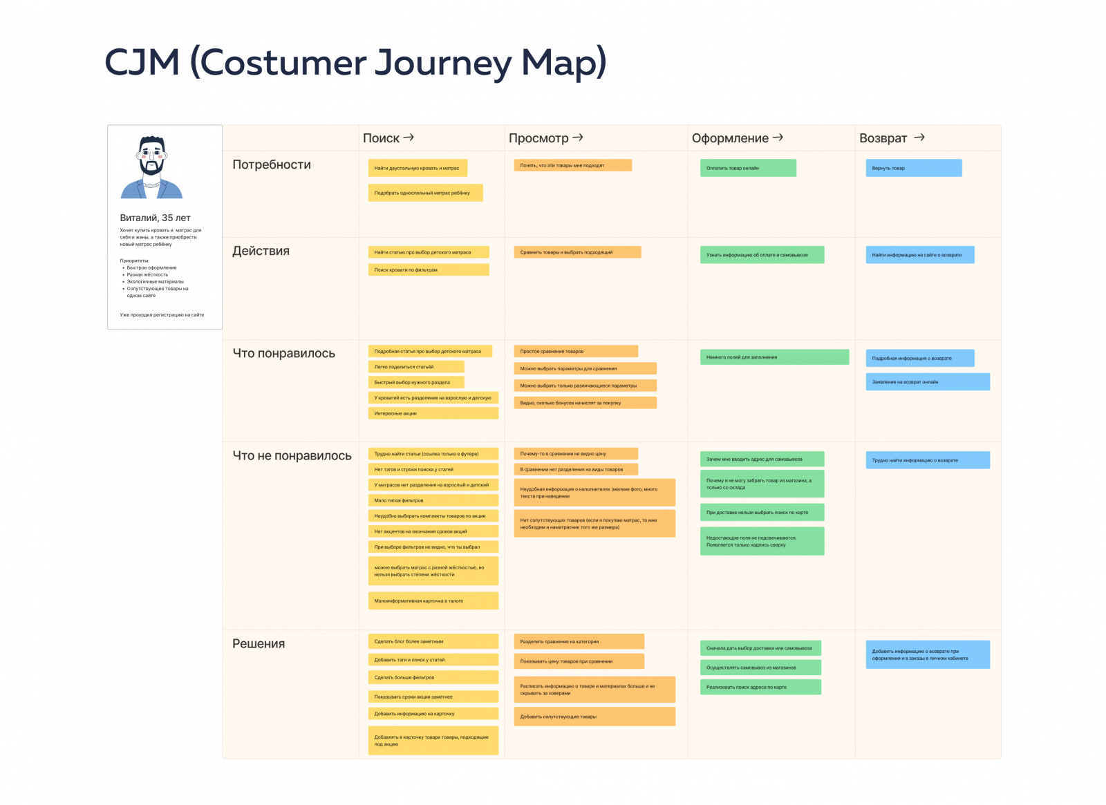 Ключевая задача CJM – определить различные потребности и барьеры, возникающие у пользователя при взаимодействии с сайтом/сервисом на разных стадиях. Если начать собирать примеры CJM в сети, то вариаций будет много. Тут нет жестких правил, но есть общепринятый фреймворк: