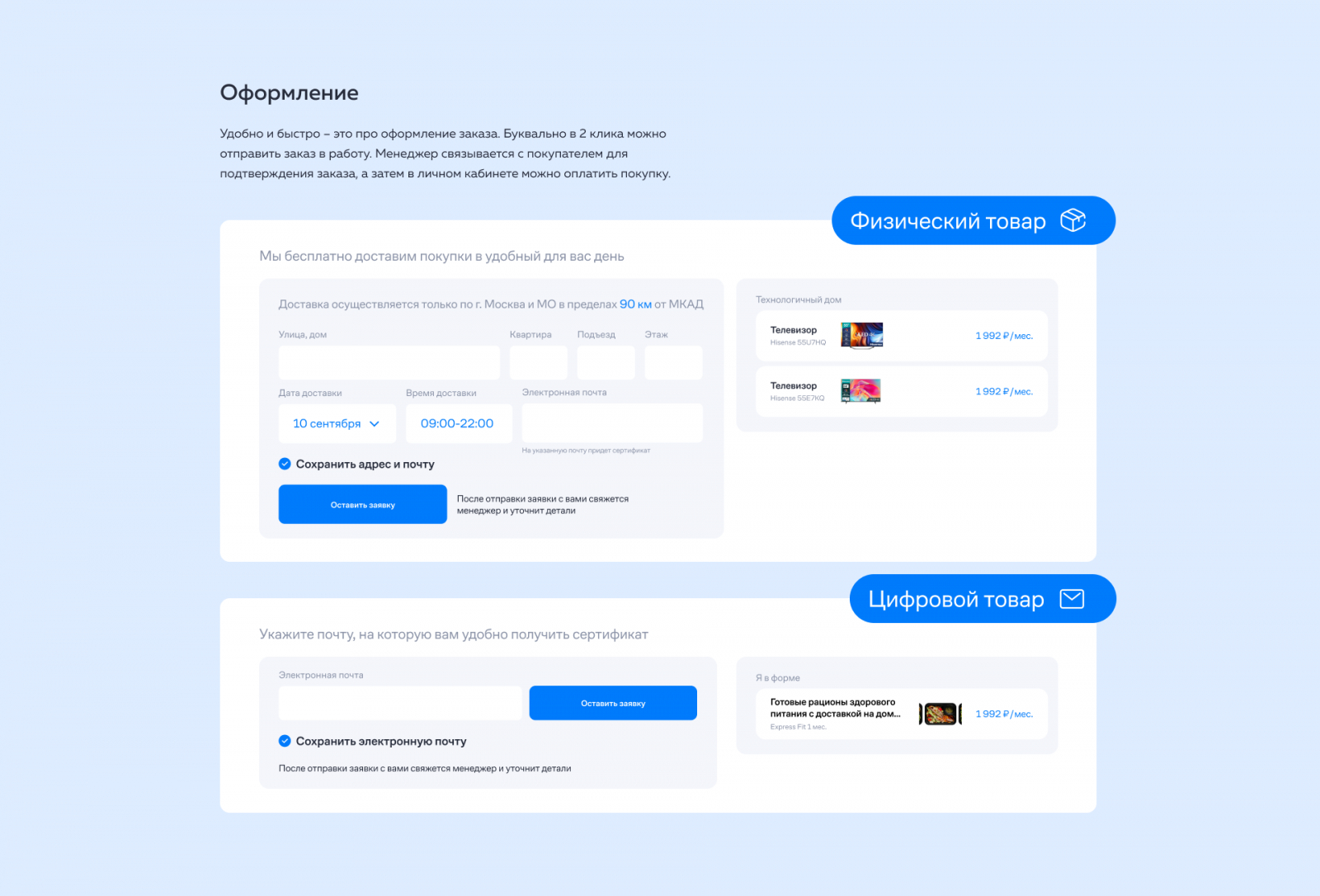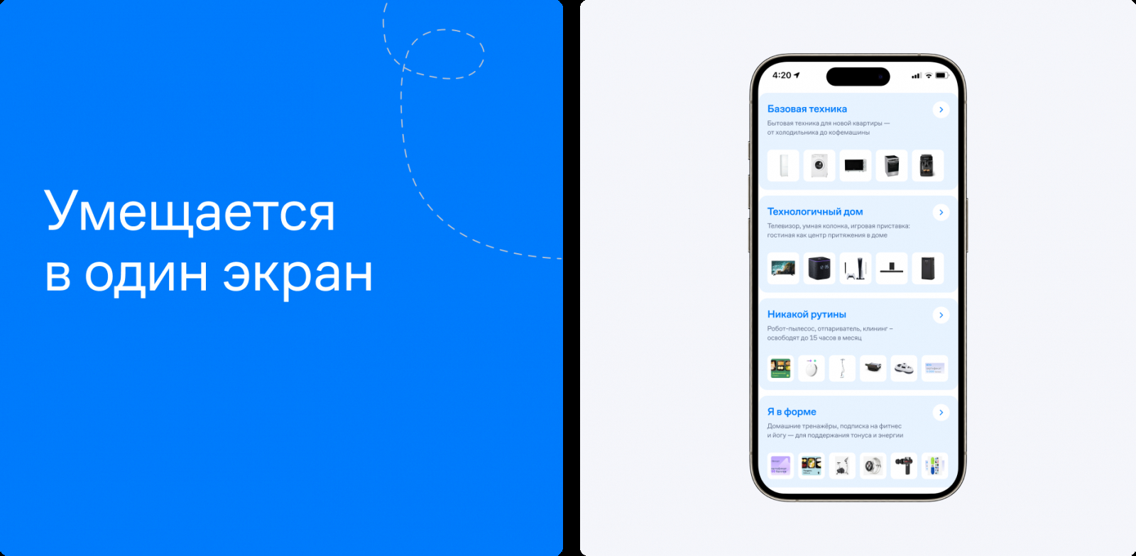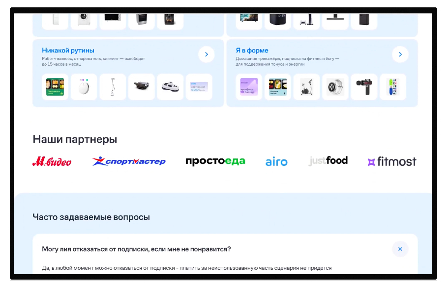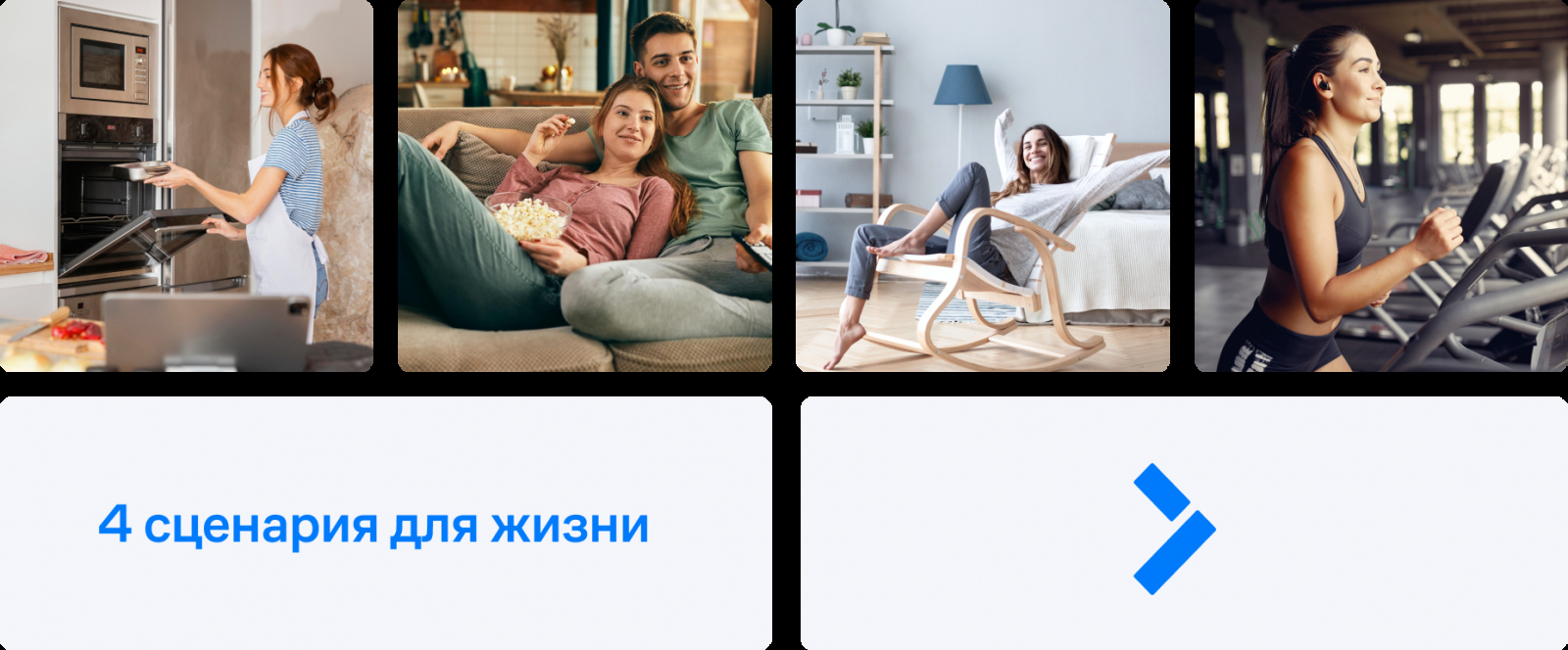 Сервис предлагает 4 сценария для основных сфер жизни. В каждом из них можно выбрать необходимые товары или абонементы. Платежи настраиваются покупателем в зависимости от его пожеланий и возможностей. И все это можно сделать на одном экране, чтобы видеть все выбранные товары и условия оплаты.