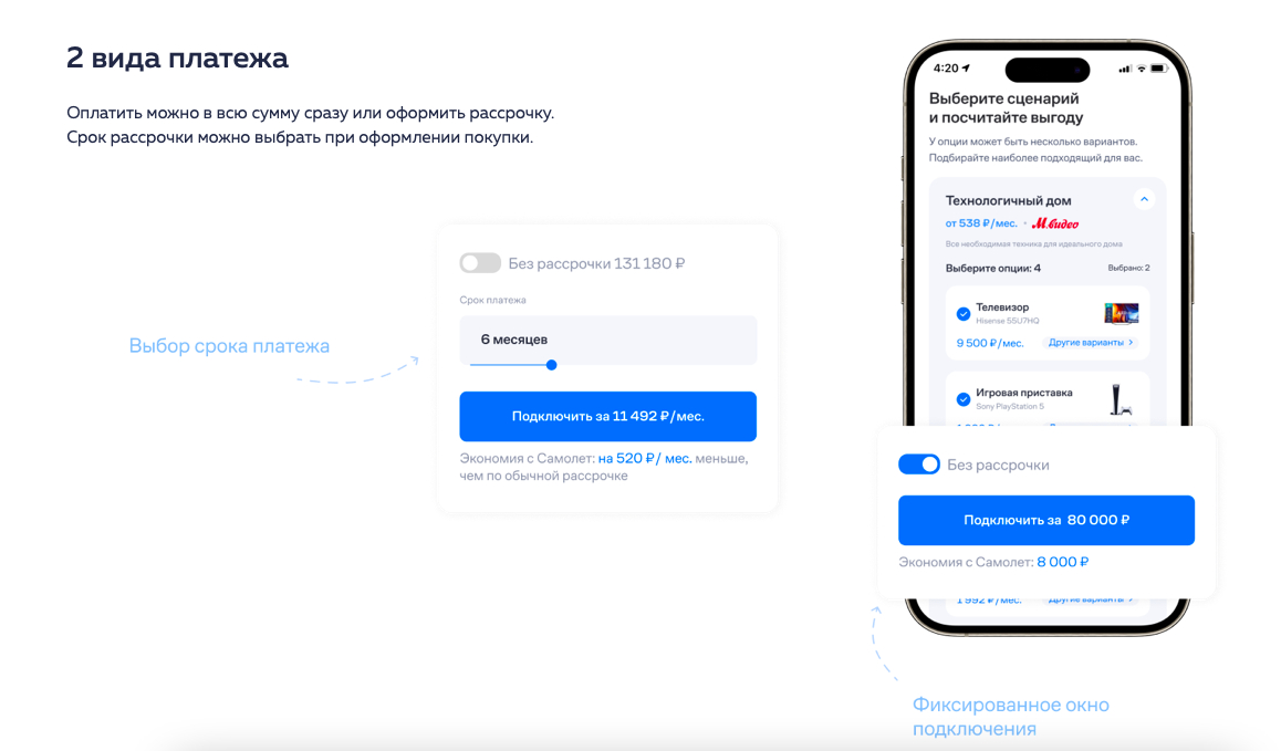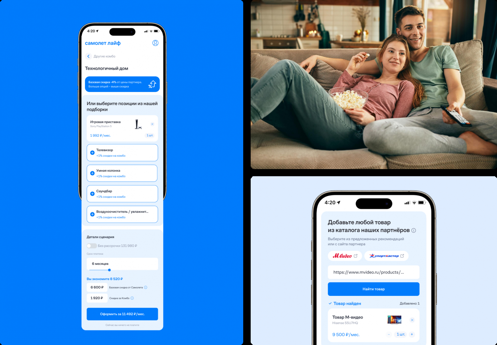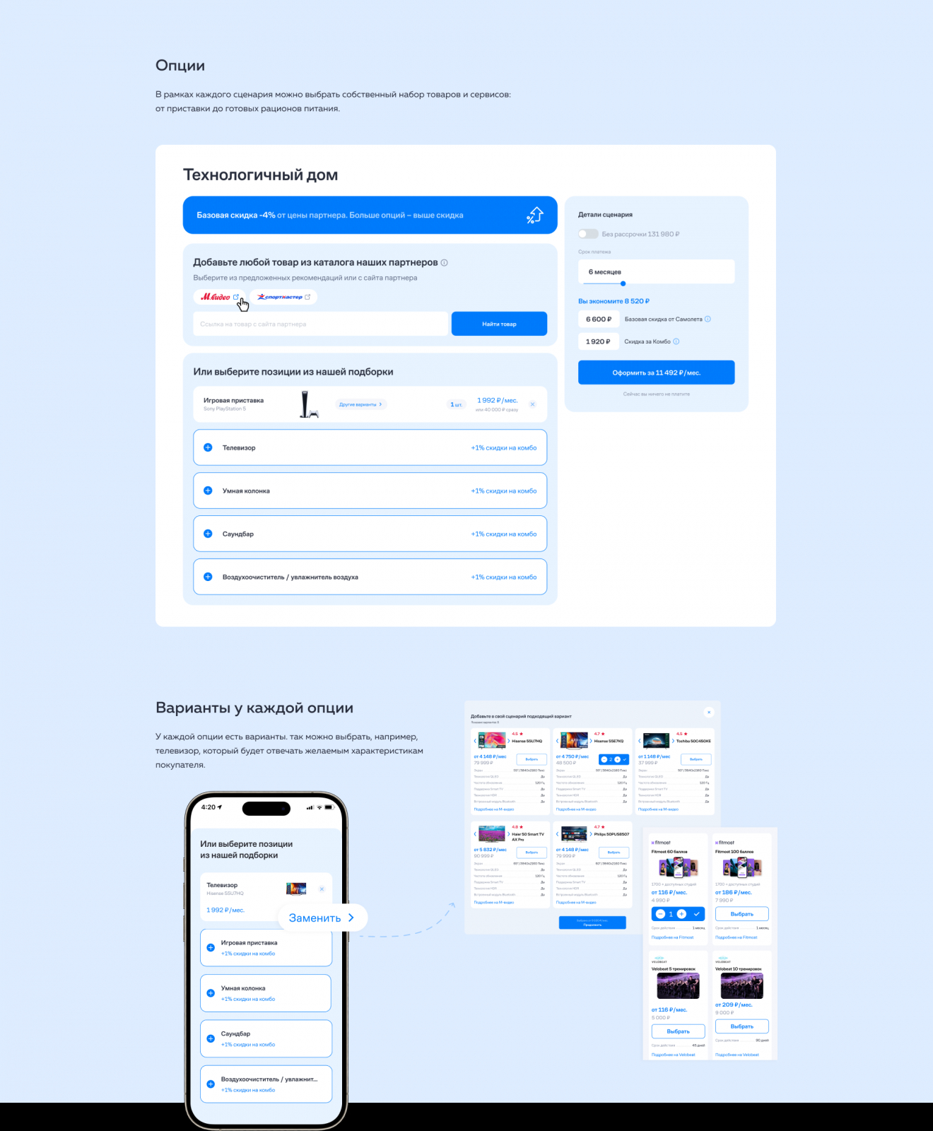 Для компании «Самолет» нужно было реализовать проект комбо-решений для комфортной жизни. Компания «Самолет» разработала сценарии покупки товаров в удобном для покупателей формате. Можно выбрать необходимый набор товаров — от бытовой техники до сервисов клининга и настроить детали платежа.