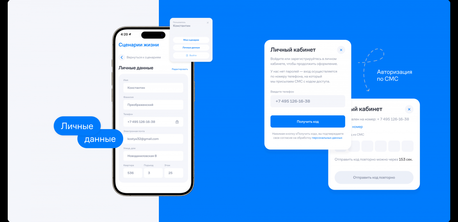 Все данные о заказах и личные данные клиента хранятся в личном кабинете. Вход осуществляется по номеру телефона через код из смс.