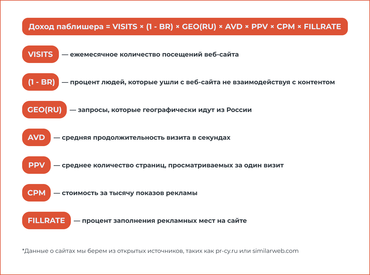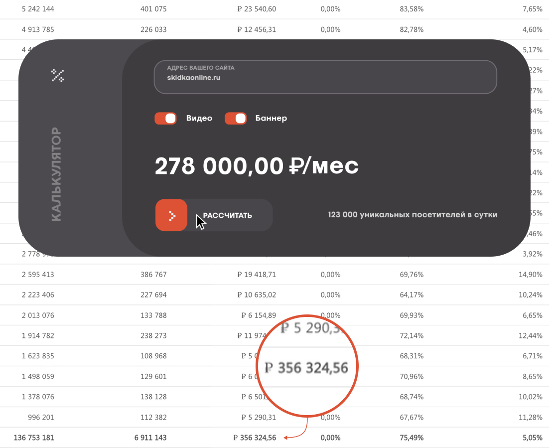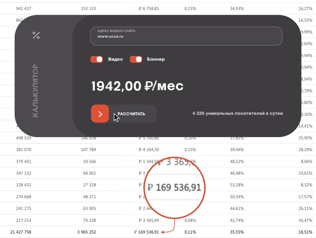 Мы не стали её скрывать — вы можете самостоятельно рассчитать доход от вашего сайта и сравнить с суммой, полученной с помощью калькулятора. Если заметите расхождения, свяжитесь с нашим саппортом. Мы поможем разобраться и уточним, на какой доход вы сможете точно рассчитывать.