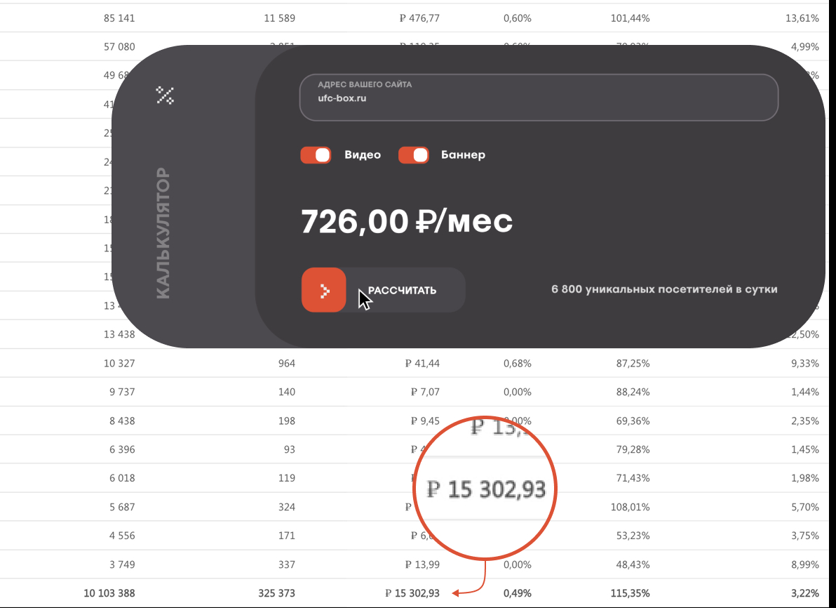 Например, для сайта UFC-BOX калькулятор прогнозировал ежемесячный доход в размере 726 рублей. На самом же деле, месячный доход UFC-BOX составил 15 302 рубля, что в 20 раз превышает расчетное значение.