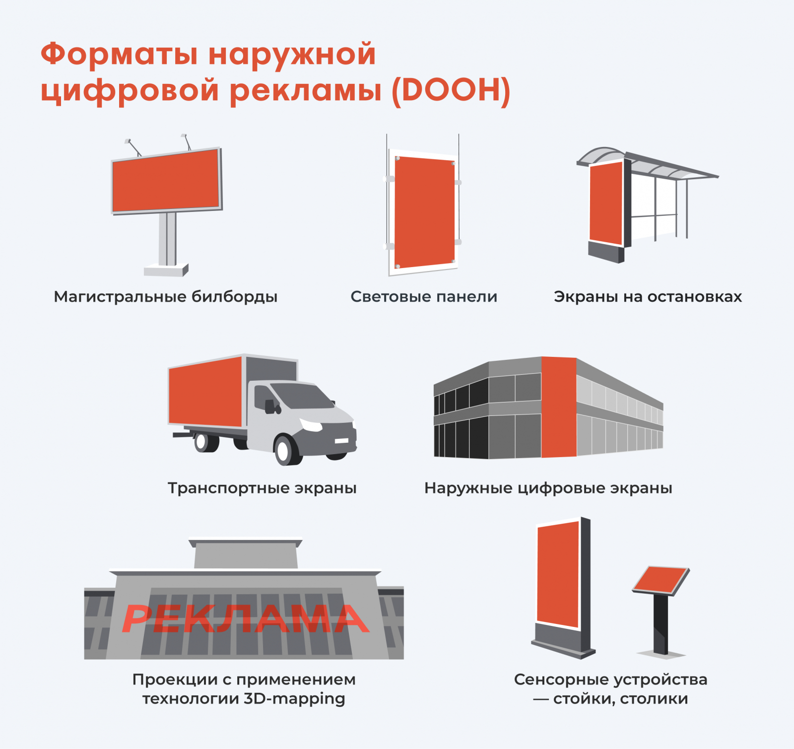 Наружная реклама направлена на клиентов, которые иногда всё же выходят из дома. Например, вы видите её по пути на работу или прогуливаясь по торговому центру. Как правило, это цифровые баннеры с информацией о конкретных продуктах. Наружную рекламу можно показать с помощью: