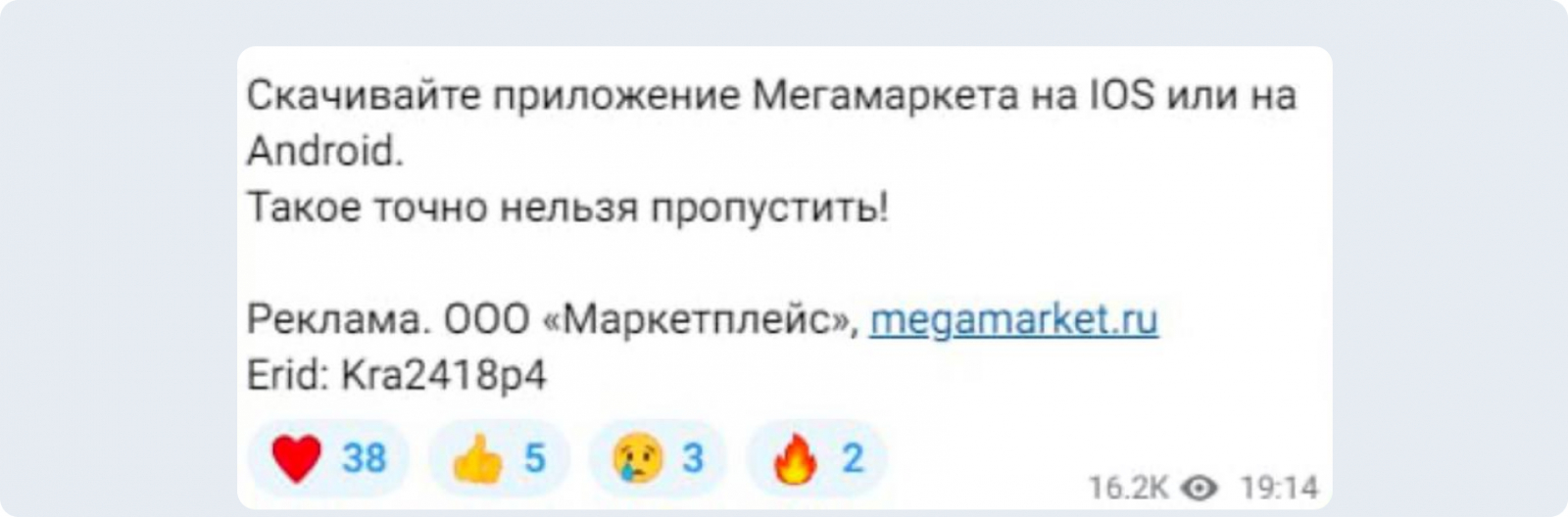 Чего не хватает? Очевидно, стоило бы сразу добавить слово «Реклама» и токен «erid». Поэтому этот пример нельзя считать на 100% удачным.