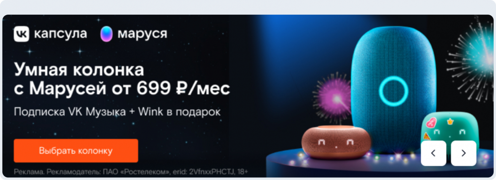 В следующем примере сайт Ростелекома рекламирует голосового помощника «Маруся» от экосистемы VK. На баннере под кнопкой «Выбрать колонку» указано:
