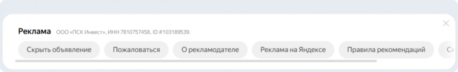 Кликаем на три точки в верхнем правом углу — раскрывается более подробная информация о рекламодателе: наименование ООО «ПСК Инвест» и ИНН (номер налогоплательщика, по нему можно получить и другие сведения из ЕГРЮЛ).