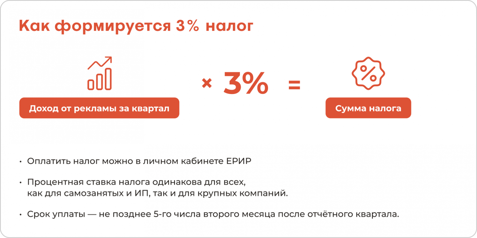 Размер отчисления составляет 3% от дохода, который был получен за размещение рекламы, и уплачивается ежеквартально. Таким образом, первый платеж должен быть исчислен с суммы поступлений за второй квартал и внесен – не позднее 5 сентября 2025 года. За третий квартал, соответственно, заплатить нужно до 15 декабря и так далее.