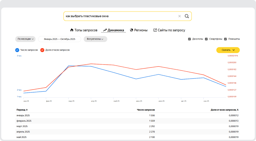 Яндекс также периодически публикует отчеты и статьи с анализом самых популярных запросов и трендов в интернете. По тому же принципу можно находить ниши в подобных рейтингах: например, в последние годы растет спрос на темы психического здоровья, ИИ и нейросетей, онлайн-обучения, покупки и благоустройства недвижимости.