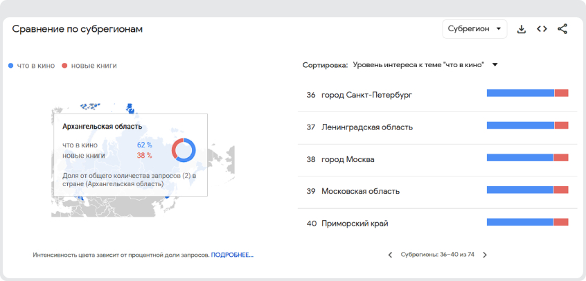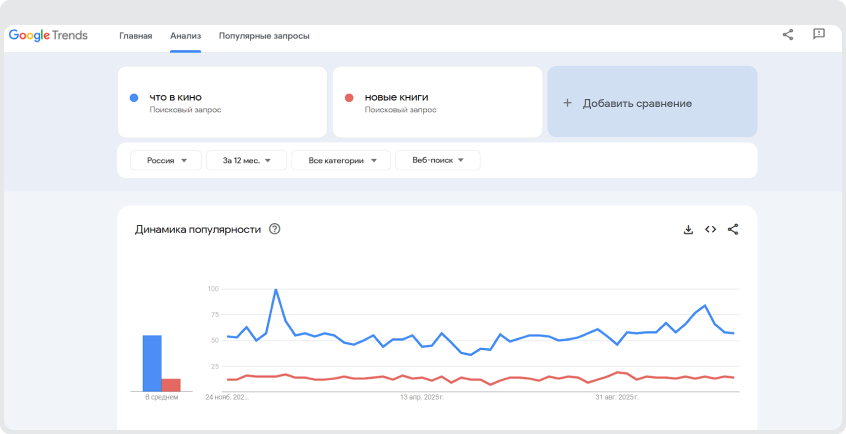Google Trends — аналог Вордстата для ПС Google. В нём есть свои фишки: например, сервис позволяет сравнить несколько запросов, посмотреть динамику популярности по годам и оценить, какие темы только начинают набирать обороты, а какие уже идут на спад.