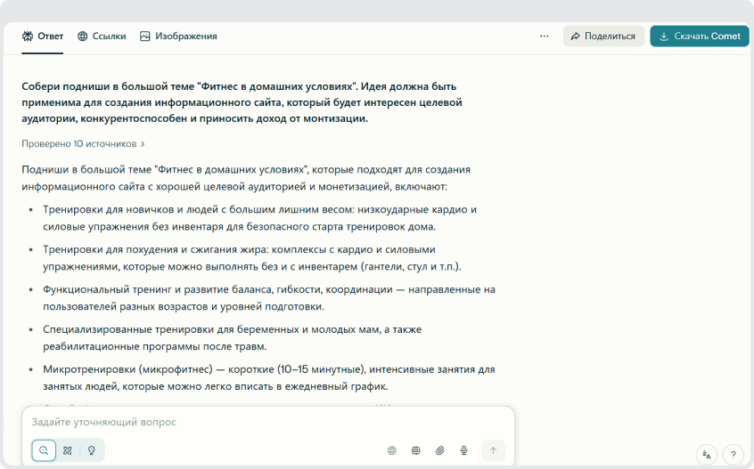 В эпоху нейросетей нельзя упускать возможность воспользоваться ими. Устройте небольшой мозговой штурм при поддержке AI-сервисов — это особенно полезно на старте, когда у вас совсем нет идей, в какой сфере развивать инфосайт.