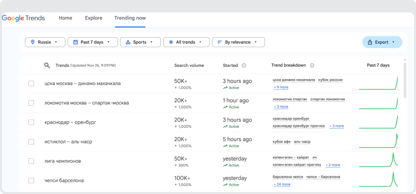 Когда заходит речь о выборе ниши, здесь не обойтись без Google Trends и Яндекс Wordstat. Эти бесплатные инструменты значительно упрощают поиск и сбор популярных поисковых запросов за определённый период и в нужных регионах.