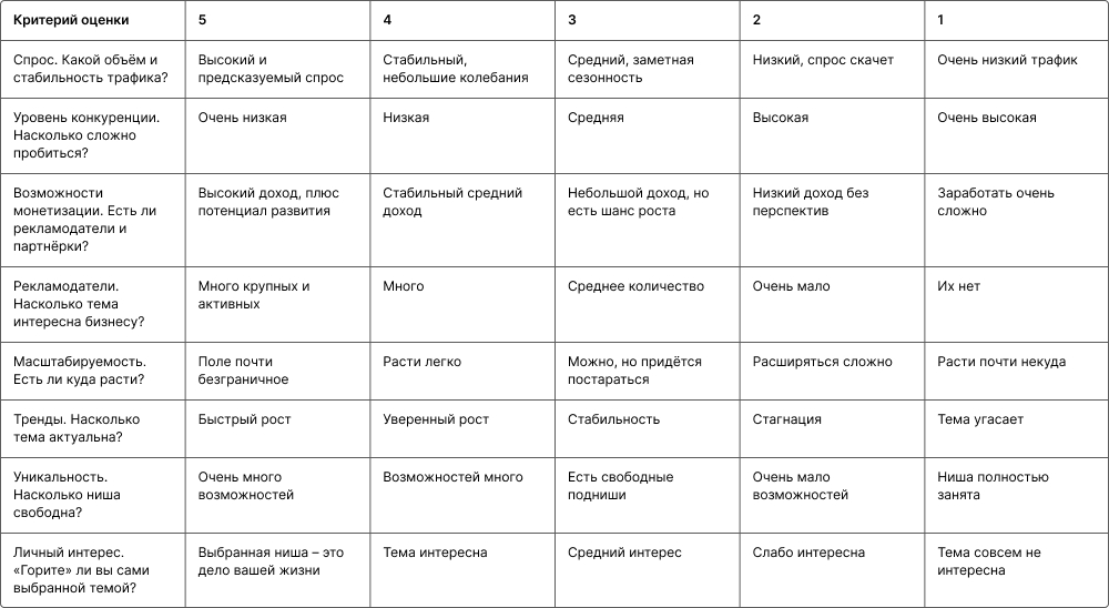 Просто оцените каждый пункт по 5-балльной шкале, а потом посмотрите на итоговый результат. Иногда такой честный самоанализ помогает вовремя свернуть в сторону, выбрать более удачную нишу или наоборот — убедиться, что вы на правильном пути.