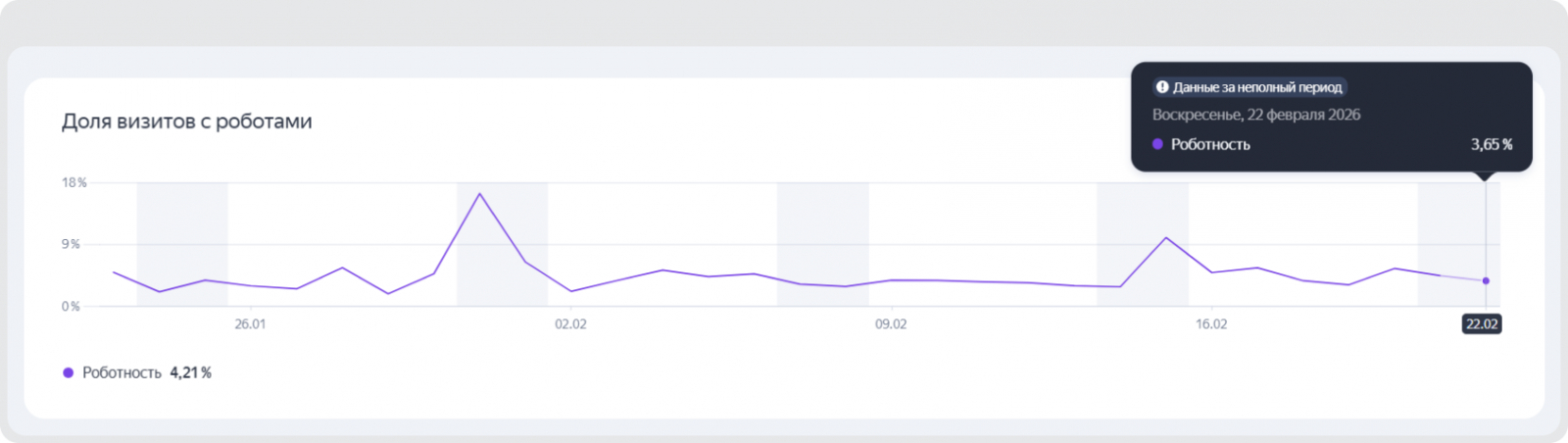 Чтобы понять масштаб проблемы, достаточно заглянуть в отчёты Яндекс Метрики и посмотреть долю роботного трафика. В нормальных условиях процент ботов на сайте обычно не превышает 5–15%. Это нормальные показатели, и стремиться к нулю здесь не нужно. Cайт обязательно должны посещать полезные боты: