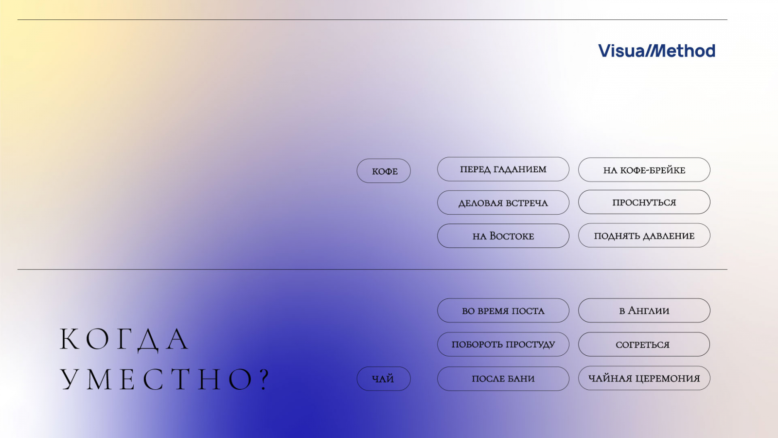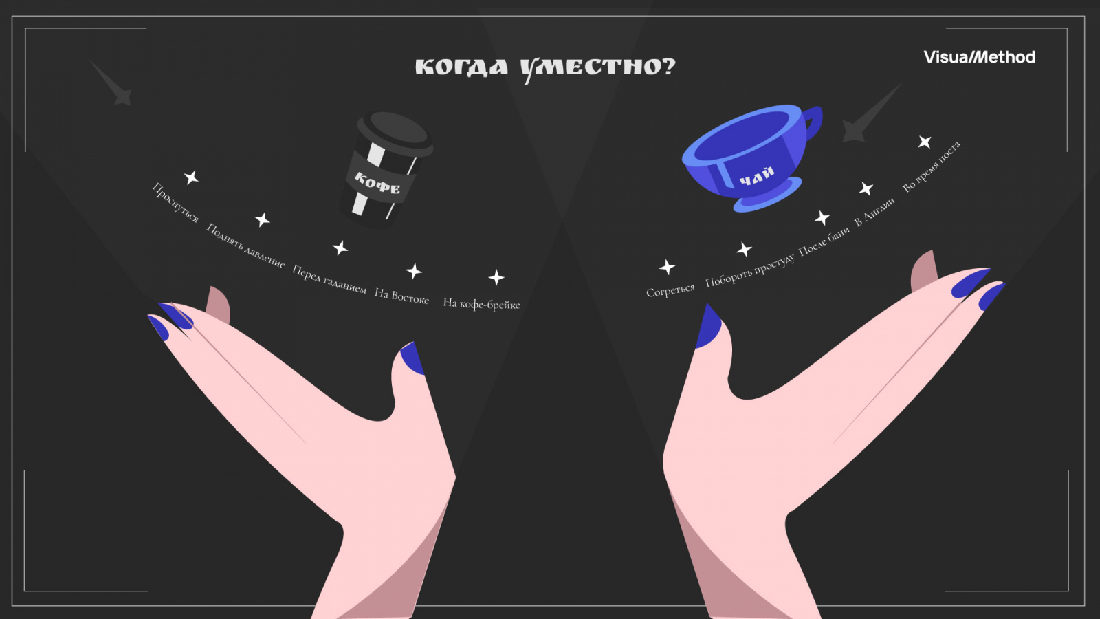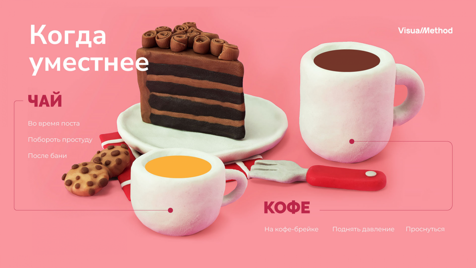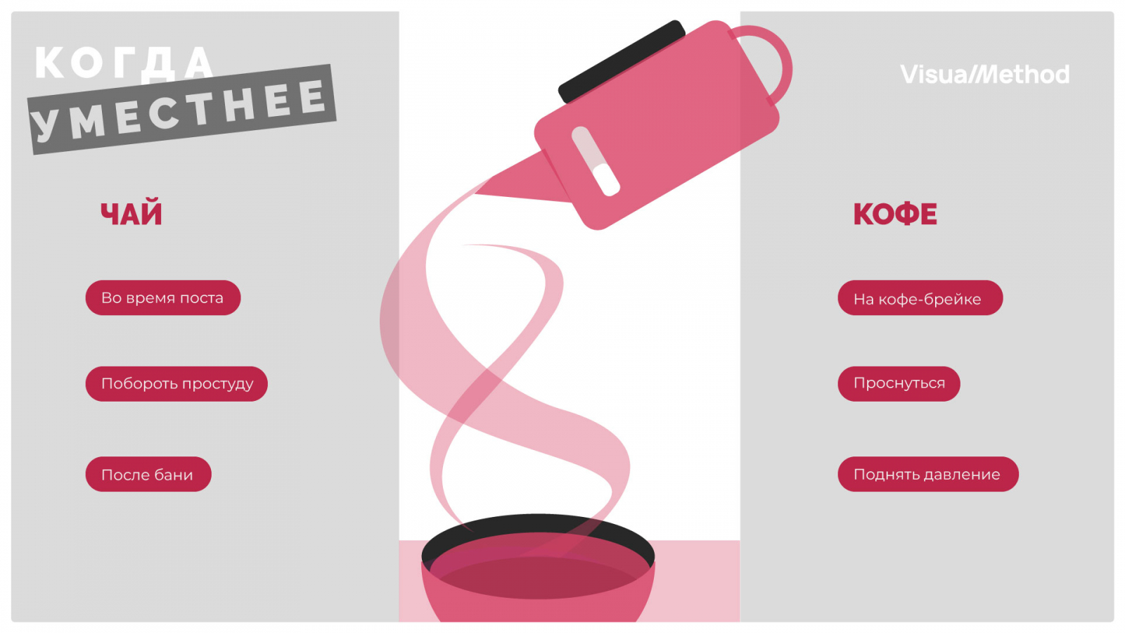 Мы берем одну тему и оформляем слайд в зависимости от тренда. В этой подборке для демонстрации трендов мы взяли тему чая и кофе: в каких случаях уместен напиток.