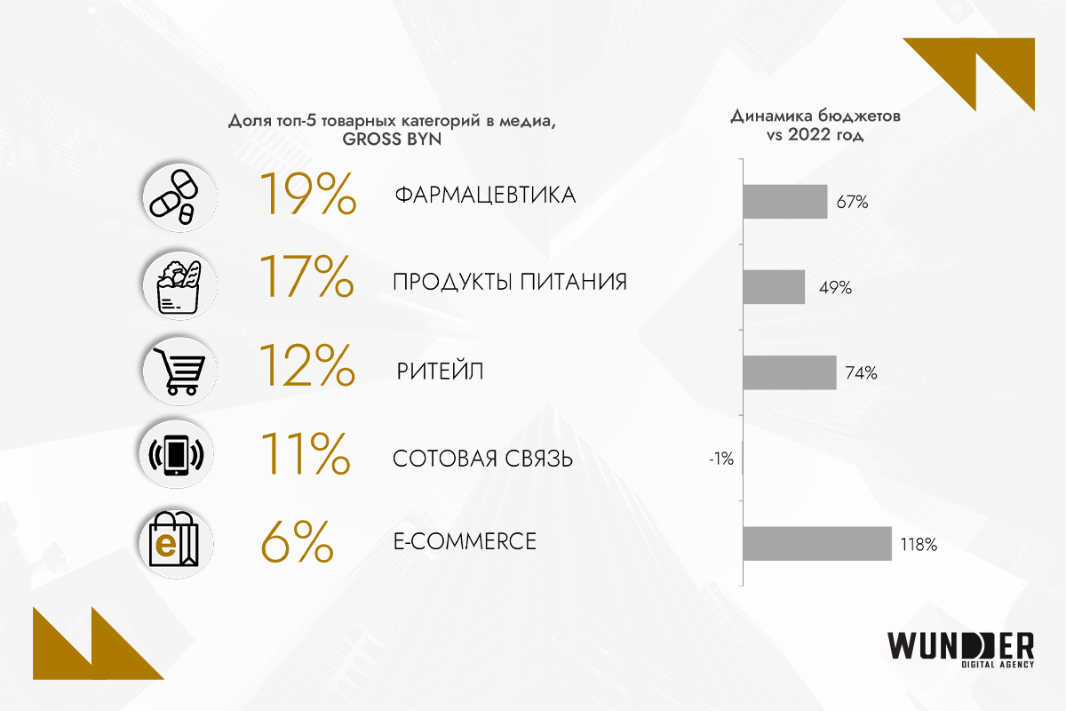 Лидерами в товарных категориях стали фармацевтика, продукты питания, ритейл и e-commerce, которые обеспечили основной рост рекламных инвестиций. Доля этих топ-5 сегментов распределилась следующим образом: 19% занимает фармацевтика, 17% приходится на продукты питания, 12% — на ритейл, 11% — на сотовую связь, и 6% — на e-commerce.