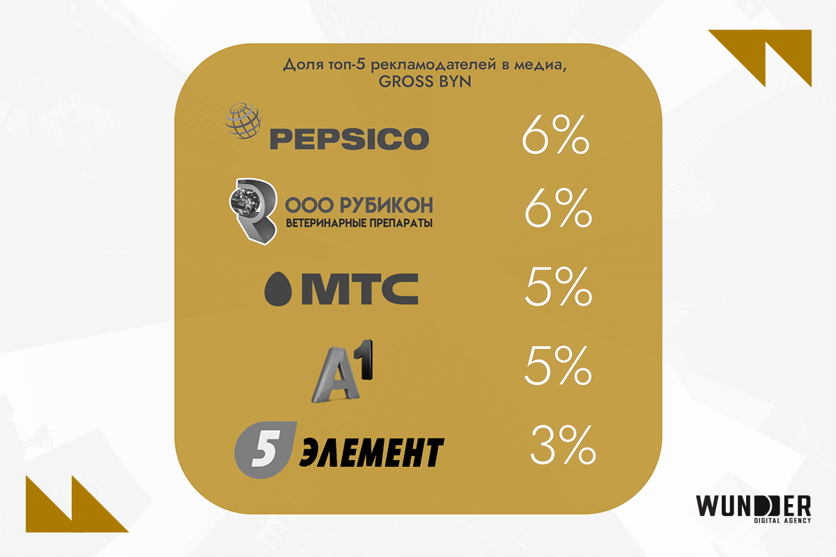 В топ-5 рекламодателей 2023 года вошли такие компании, как PepsiCo, ООО «Рубикон», МТС, A1 и «5 элемент», которые имели примерно одинаковые доли на рынке, что подчеркивает разнообразие лидеров в различных секторах экономики.