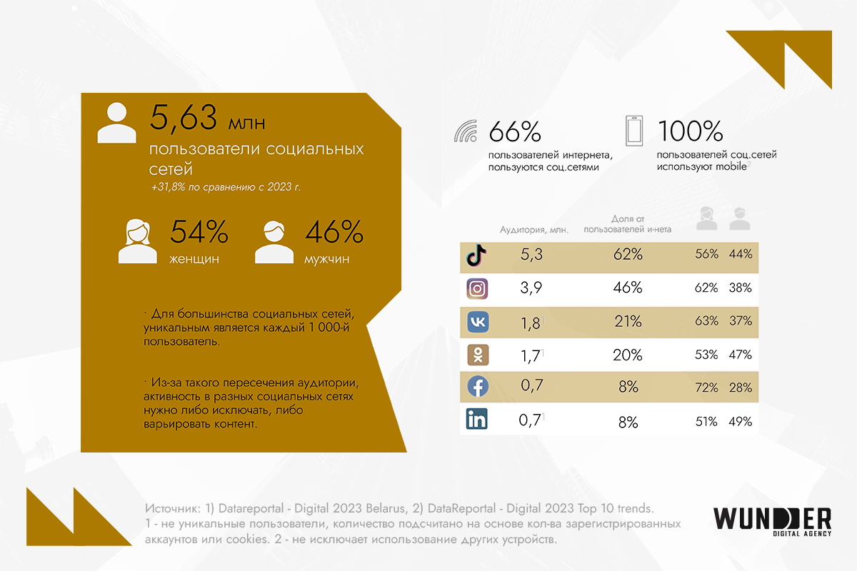Что касается распределения по возрасту, то в Беларуси наиболее молодая аудитория сосредоточена в TikTok, где 41% пользователей — в возрасте 18-24 лет, в то время как Instagram* и VK популярны среди более широкого возрастного диапазона, особенно в группах 18-34 года. Одноклассники и Facebook* привлекают старшую аудиторию с наибольшей долей пользователей в возрасте 45+ лет, особенно в группе 55+, где 33% приходится на Одноклассники и 23% на Facebook*.
