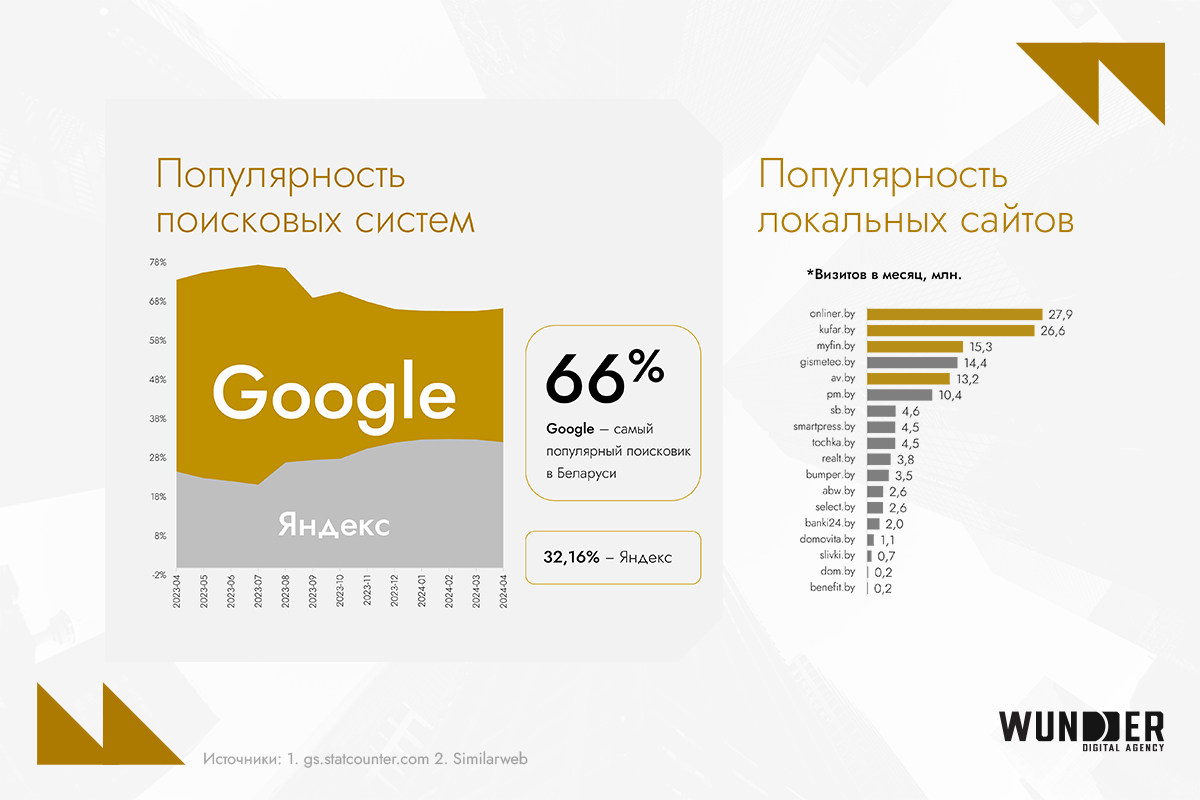Google — с долей в 66% остается самым популярным поисковиком в Беларуси. Яндекс, однако, занимает треть — 32,16% всей аудитории. Среди популярных сайтов: каталоги товаров, новостные ресурсы и маркетплейсы.