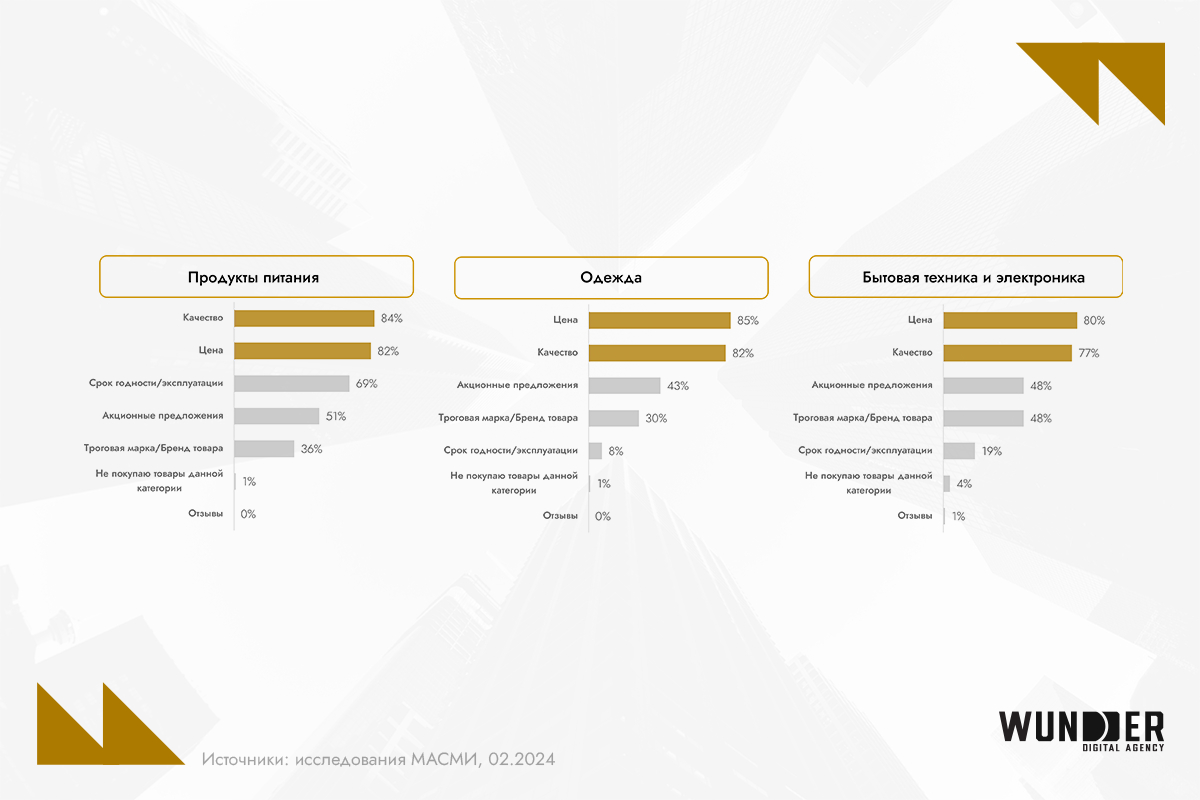 Покупательские тренды показывают, что при выборе товаров в категориях продуктов питания, одежды и бытовой техники/электроники люди в первую очередь обращают внимание на качество и цену. В продуктах питания качество важно для 84%, а цена для 82% покупателей, также значимы репутация (69%) и акции (51%), при этом бренд имеет значение для 36%. В одежде на первое место выходит цена (85%), затем качество (82%), акции (43%) и бренд (30%). В бытовой технике и электронике главные факторы — цена (80%) и качество (77%), с равной важностью акций и бренда (48%). Интересно, что бренд особенно важен в категории продуктов питания (для 30% аудитории). Однако здесь следует учитывать, что данная цифра относится к категории «продукты питания» в целом, но в различных подкатегориях данный показатель может отличаться от среднего.