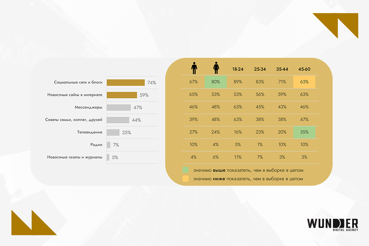 Основными источниками информации о товарах и услугах являются социальные сети и блоги (74%), новостные сайты в интернете (59%) и мессенджеры (47%). Меньше всего потребляют информацию из ТВ, радио и печатных изданий.