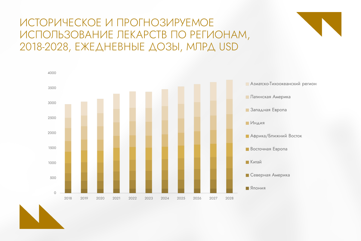 В целом, к 2028 году в Северной и Латинской Америке, Восточной и Западной Европе, а также в Африке и на Ближнем Востоке расходы на фармацевтические товары вырастут более чем на 30%. Это говорит не только о росте объемов потребления, но и о смещении спроса в сторону более дорогостоящих, высокотехнологичных препаратов.
