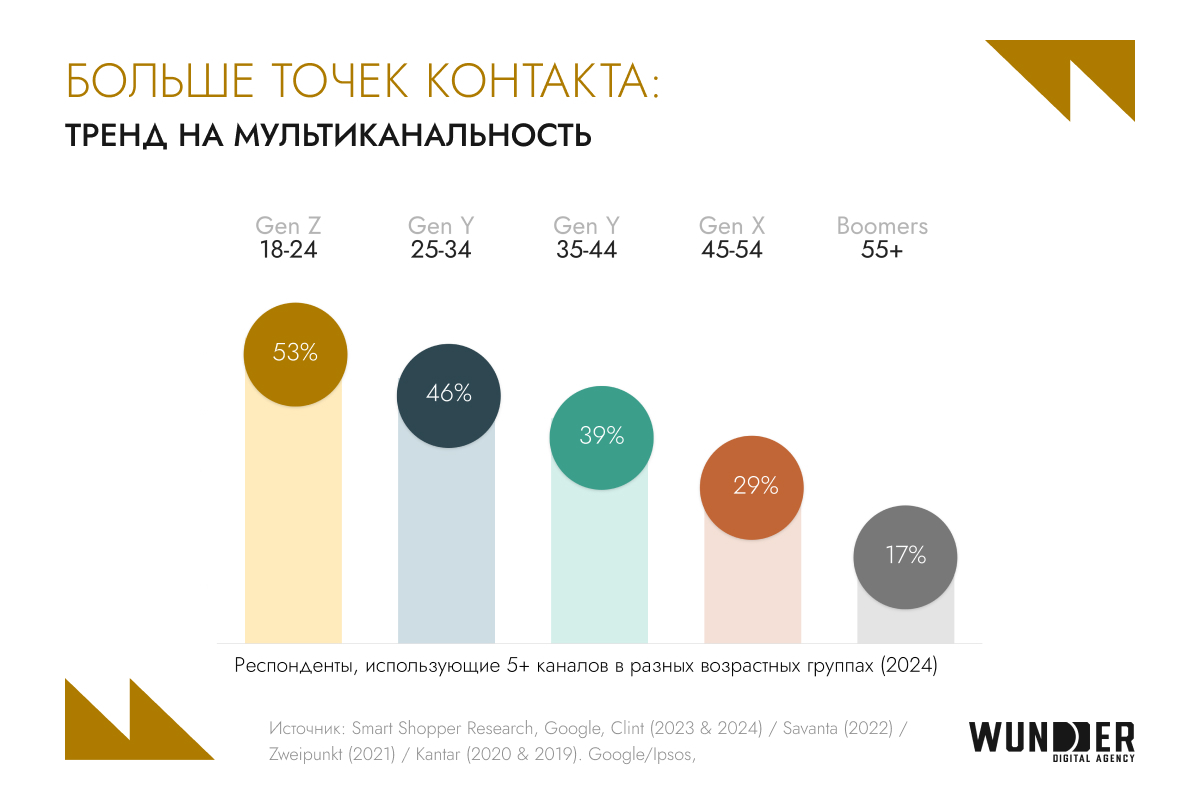 В условиях насыщенного инфополя брендам становится все сложнее удерживать внимание аудитории. Один из главных трендов 2025 года — рост мультиканального поведения, особенно среди молодых потребителей. Чем моложе покупатель, тем больше каналов он использует перед покупкой: среди поколения Z (18-24 года) 53% взаимодействуют с пятью и более каналами перед принятием решения. Для сравнения: среди поколения Boomers (55+) этот показатель составляет всего 17%.