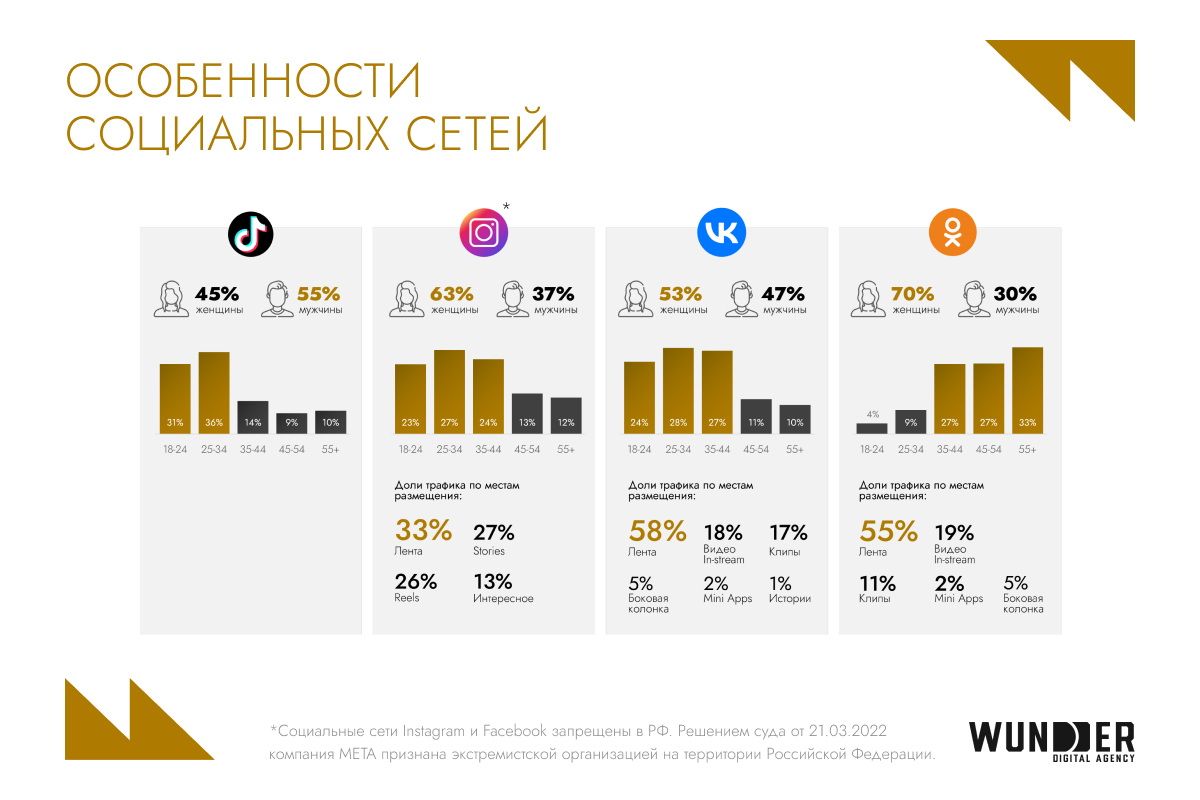 Такое распределение подсказывает, как именно стоит выстраивать коммуникацию. Например, если бренд работает с женской ЦА — логично усиливать присутствие в Instagram*. Если аудитория моложе и активнее вовлекается в видеоконтент, TikTok дает максимальный охват и вовлеченность, особенно среди мужчин.