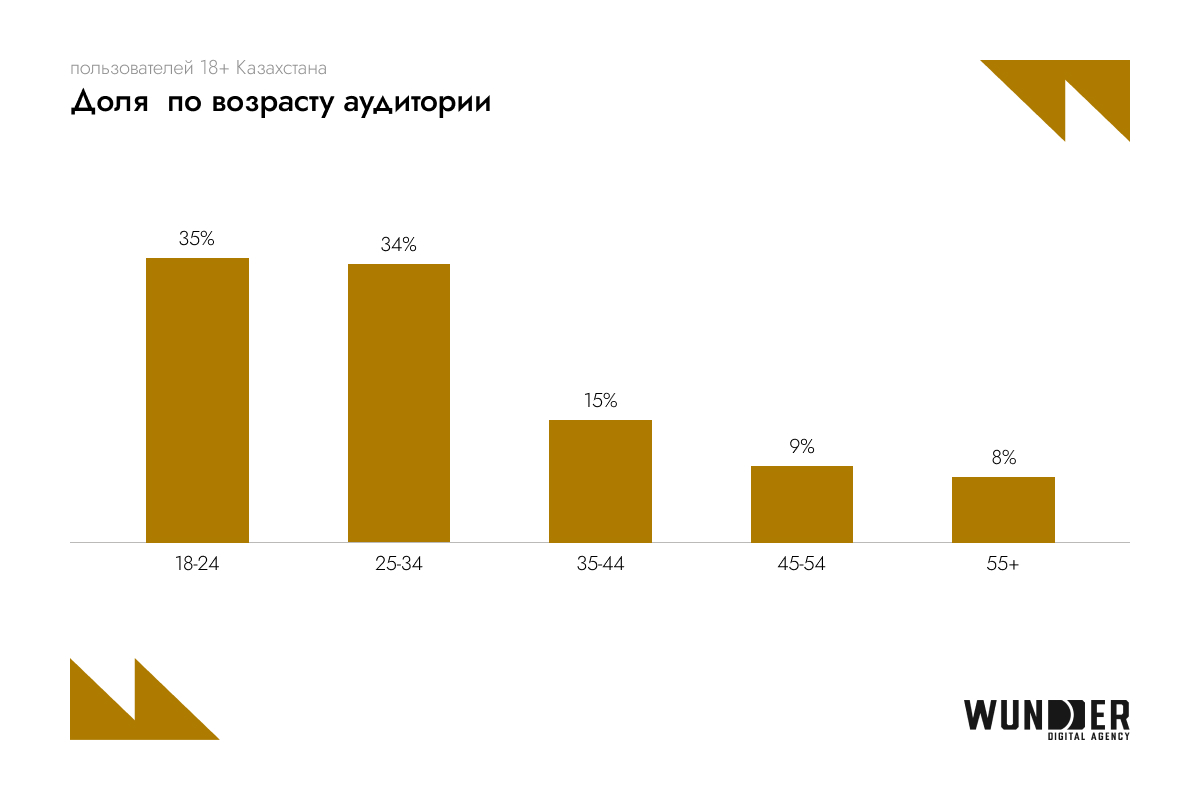 Аудитория YouTube в Казахстане сбалансирована по полу (53% — женщины, 47% — мужчины), а возрастное ядро сосредоточено в сегменте 25-44 лет — самой активной и платежеспособной группе. Наибольший интерес у казахстанских пользователей вызывает контент из категорий развлечение, лайфстайл и музыка.