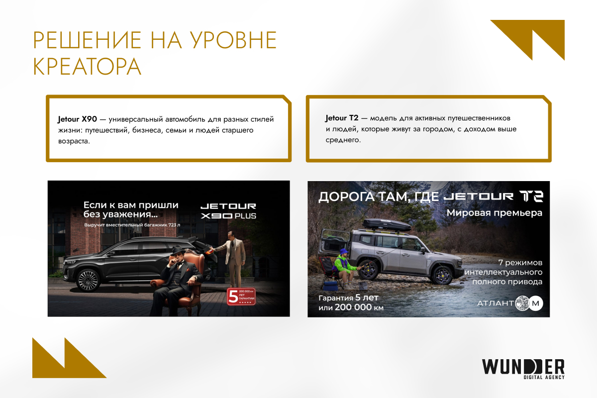 Инсайт для разработки креативов на стороне клиента: аудитория нуждается в культурных ассоциациях, чтобы воспринимать Jetour как близкий бренд и отличать его от конкурентов.