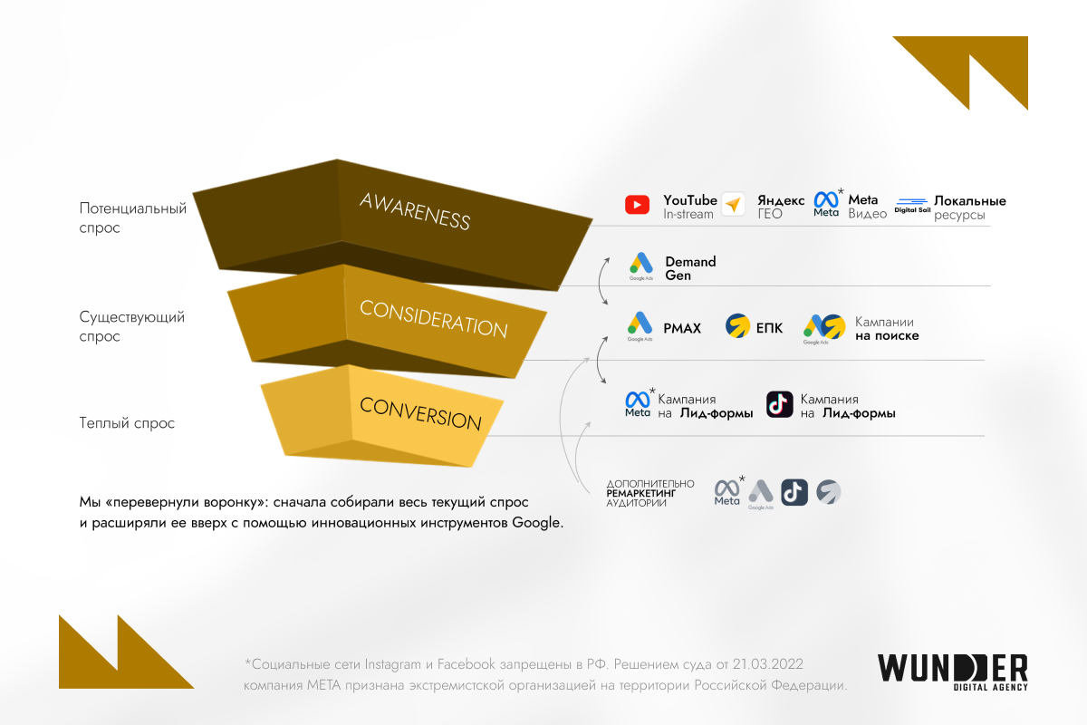 В Wunder Digital также изменили подход к охватным и лидогенерационным инструментам, фокусируясь на создании знания о бренде там, где конкуренты собирали только горячий спрос. Ключевым стало использование «перевернутой воронки»: сначала фиксировался текущий спрос, затем он расширялся вверх через инновационные инструменты Google.