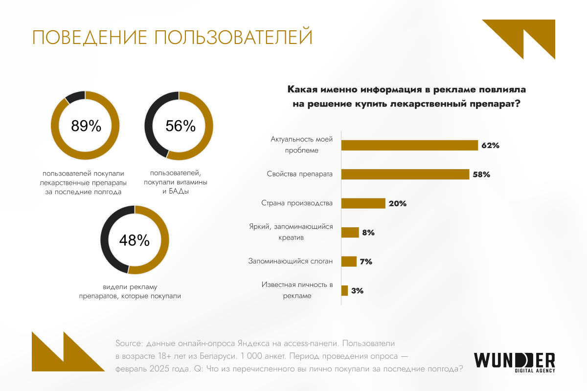 Белорусский фармрынок стремительно цифровизируется. Люди ищут лекарства в интернете, сравнивают цены на порталах и готовы заказывать препараты онлайн. Но при этом лояльность остается низкой: каждый второй покупатель без колебаний меняет привычный продукт на аналог, а каждый четвертый продолжает искать альтернативу даже в аптеке. Инновационный digital-хаб Wunder Digital рассказал, как брендам выстраивать эффективную коммуникацию с аудиторией в новых условиях.