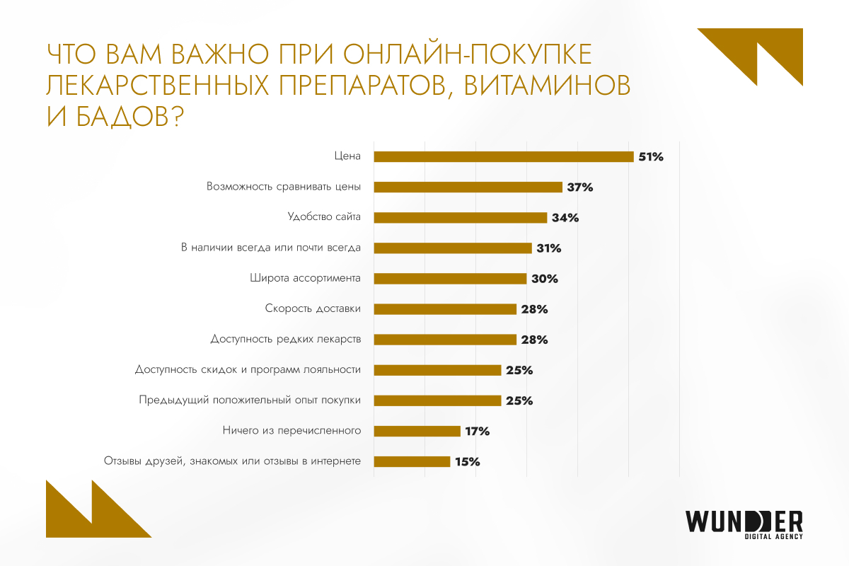Все заметнее становится тренд на онлайн-покупки: около 30% пользователей готовы заказывать лекарства, витамины и БАДы в интернете. Для них важны прежде всего цена, возможность сравнивать предложения и удобство оформления. В этом плане особую роль играют тематические площадки 103.by и tabletka.by. Здесь пользователи не только выбирают препараты, но и активно сопоставляют аптеки и условия покупки.
