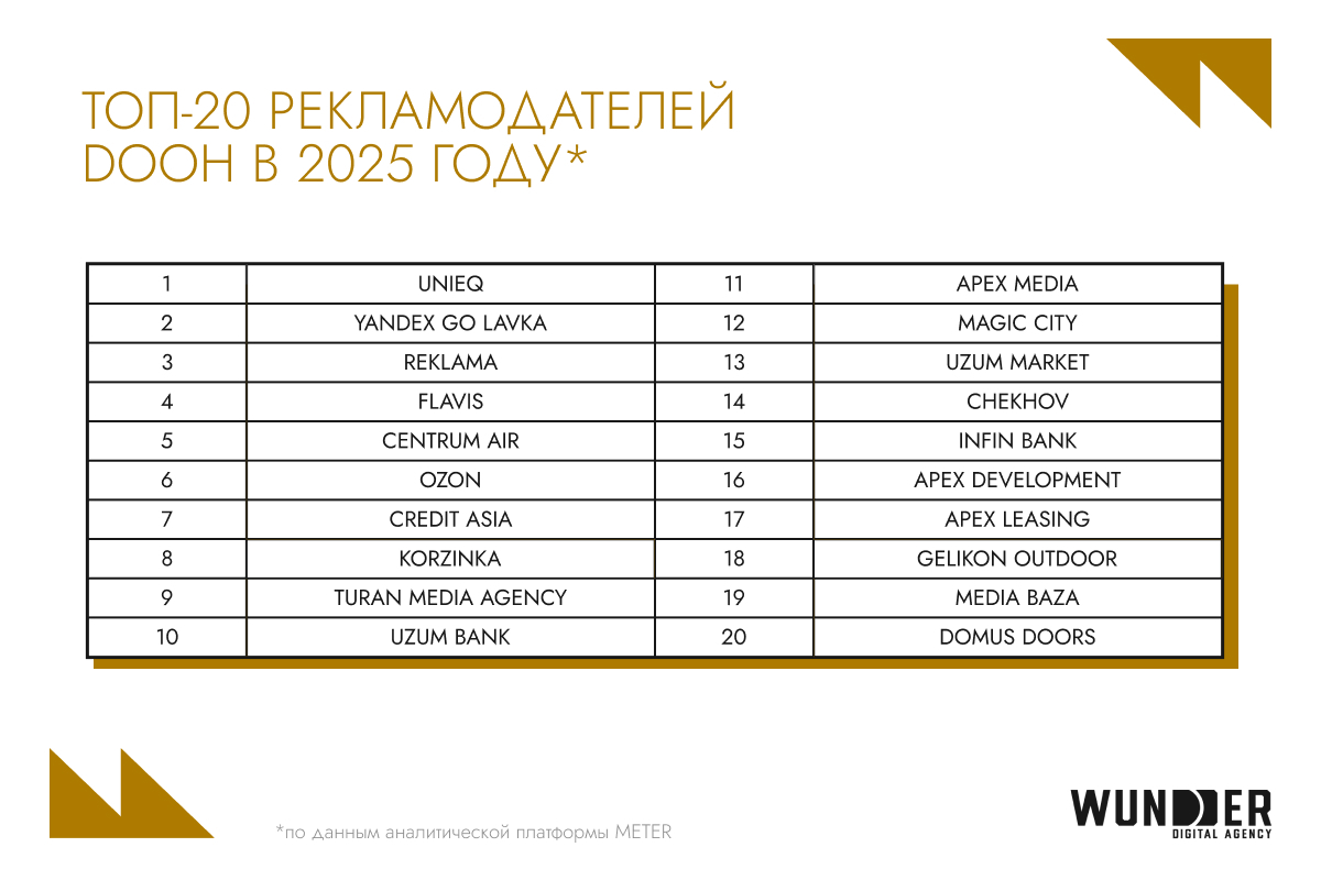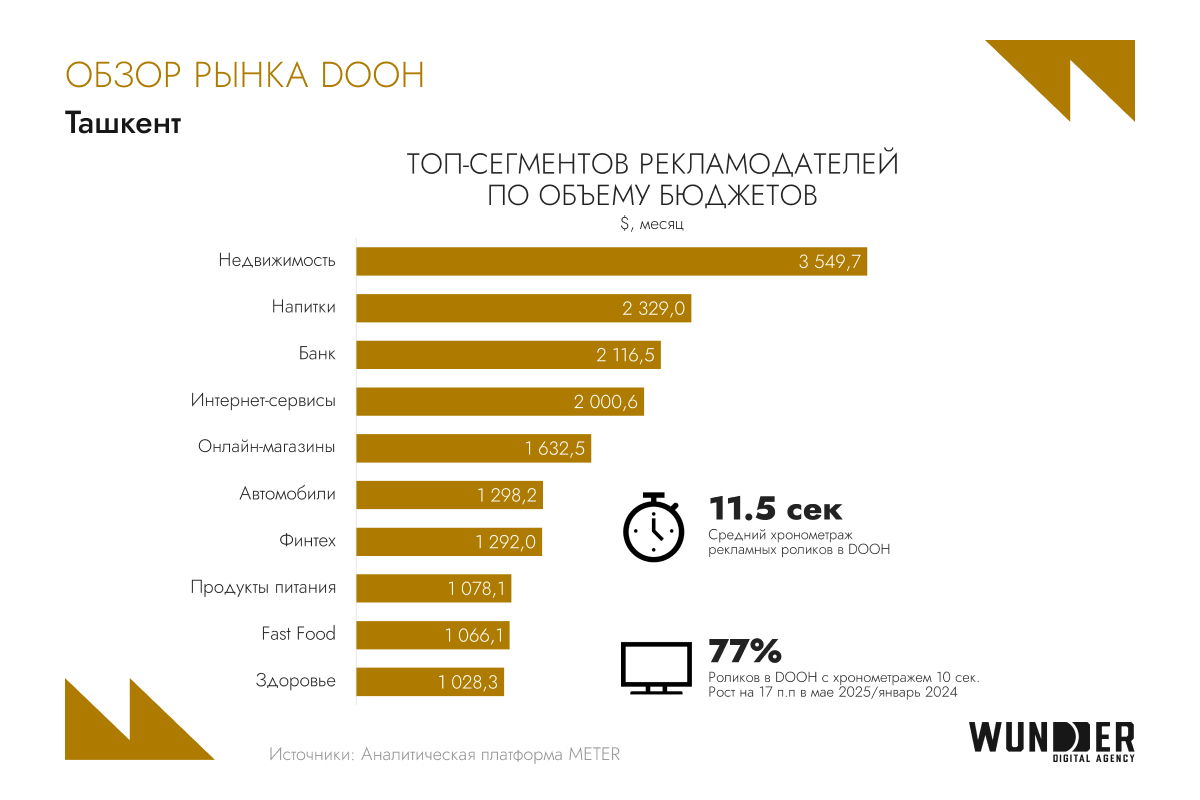Наружная реклама продолжает усиливать свои позиции — в первую очередь за счет роста сегмента DOOH и повышения прозрачности медиапланирования. В 2025 году цифровые форматы занимают около 35% всего наружного инвентаря в Узбекистане. Особенно активно DOOH используют компании из сферы недвижимости, производители напитков и банки. Для FMCG-брендов и девелоперов это направление становится ключевым каналом при построении высокой узнаваемости и максимального охвата.