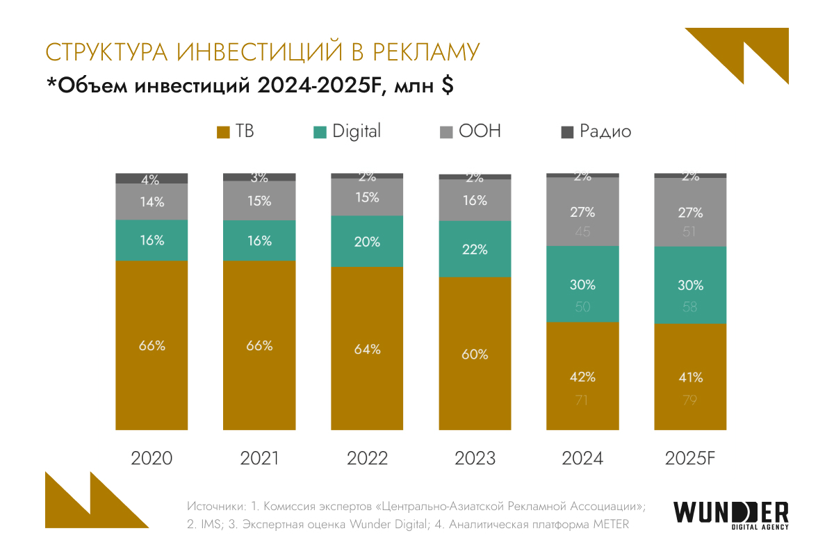 Телевизионная реклама все еще сохраняет статус ключевого канала по объему инвестиций, однако ее доля постепенно снижается. На первый план выходит digital — сегодня это основной драйвер роста. Начиная с 2021 года цифровой сегмент практически удвоил свою долю и в 2025 году и, по прогнозам, закрепит за собой около 30% медиарынка. Это во многом обусловлено ростом интереса со стороны крупных локальных и международных брендов, которые все активнее перераспределяют бюджеты в digital-среду.