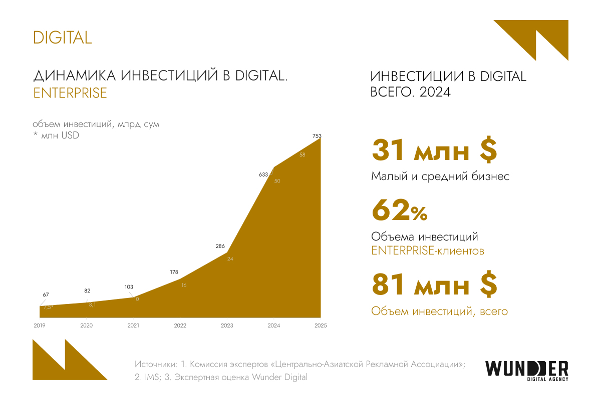 Однако именно digital сегодня становится центром притяжения новых бюджетов, инновационных решений и высоких ожиданий по эффективности. С 2019 по 2025 объем инвестиций в digital вырос с 67 до 753 млрд сум в год — увеличение в более чем 11 раз отражает масштабные изменения в стратегиях размещения как крупных, так и средних игроков. При этом важным участником цифрового рынка стал малый и средний бизнес. Несмотря на ограниченные бюджеты, именно массовость размещений со стороны МСБ значительно влияет на конкуренцию в рекламных аукционах.