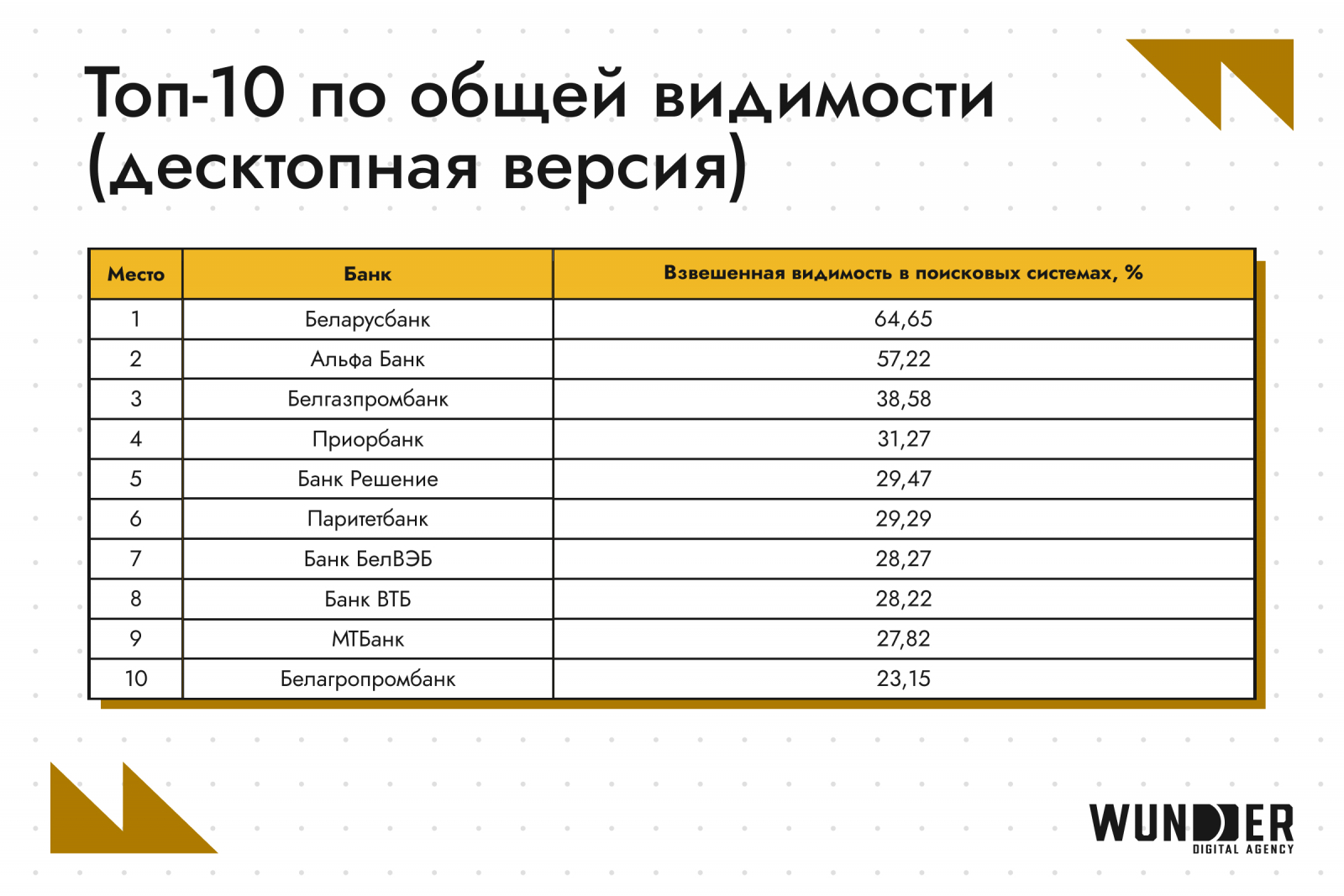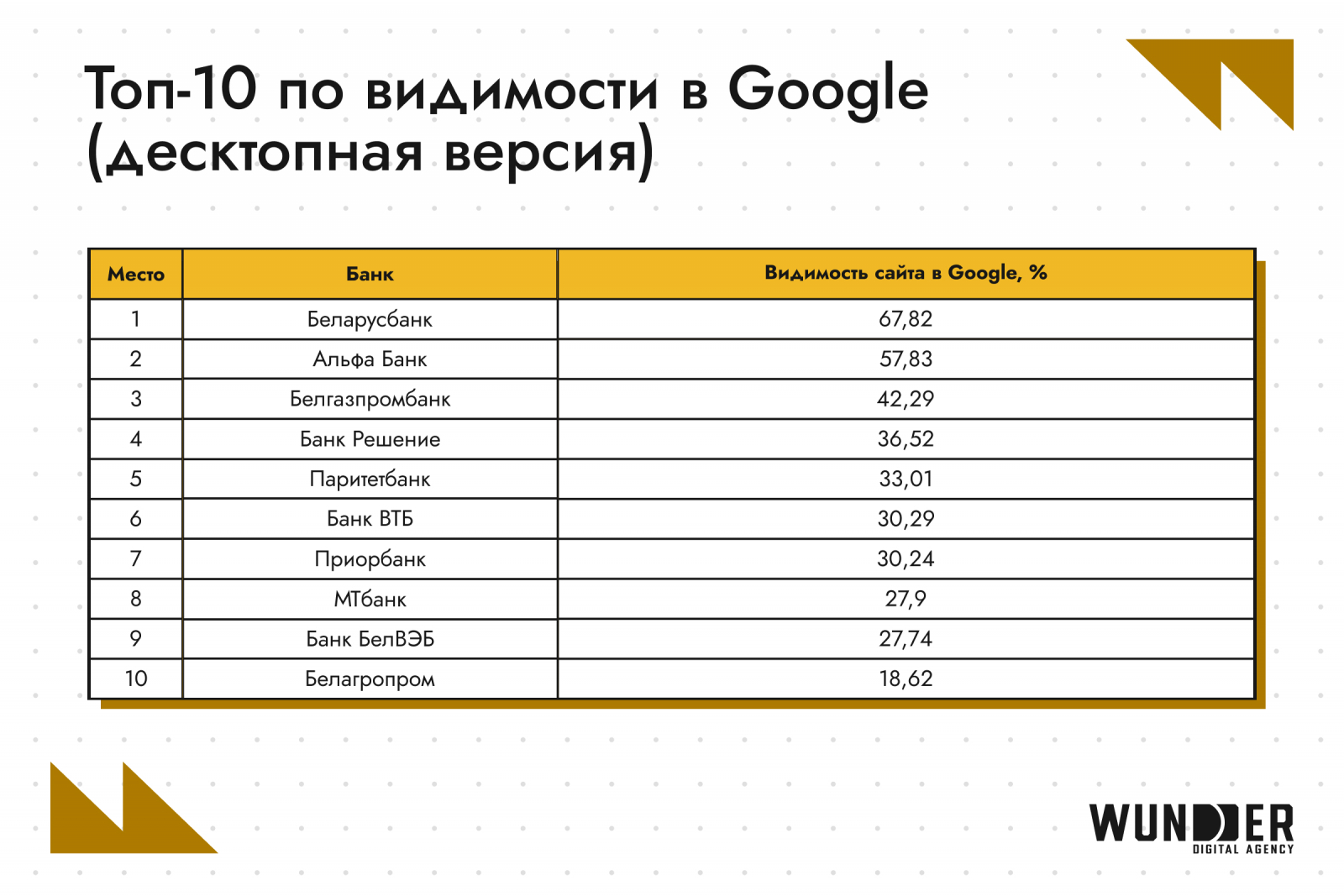 - Топ-3 по видимости в Google идентичен взвешенной видимости – Беларусбанк (67,82%), «Альфа Банк» (57,83%) и «Белгазпромбанк» (42,29%).
