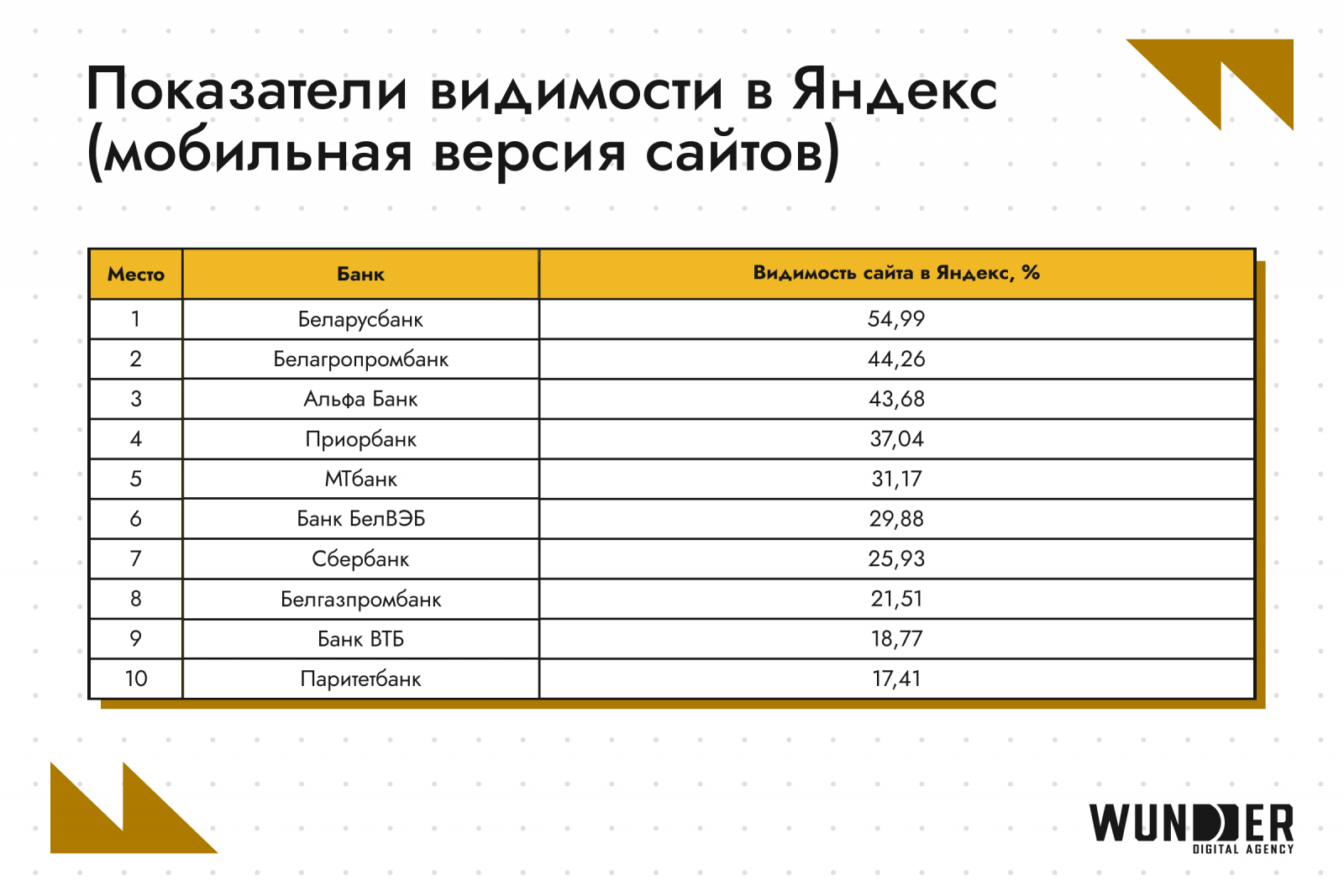 - Беларусбанк вернул себе лидерство по видимости в Яндексе с показателем 54,99%. Вторым стал «Белагропромбанк» с 44,26%, который в июне занимал 10-е место. На третьей позиции с минимальным отставанием разместился «Альфа Банк» (43,68%).